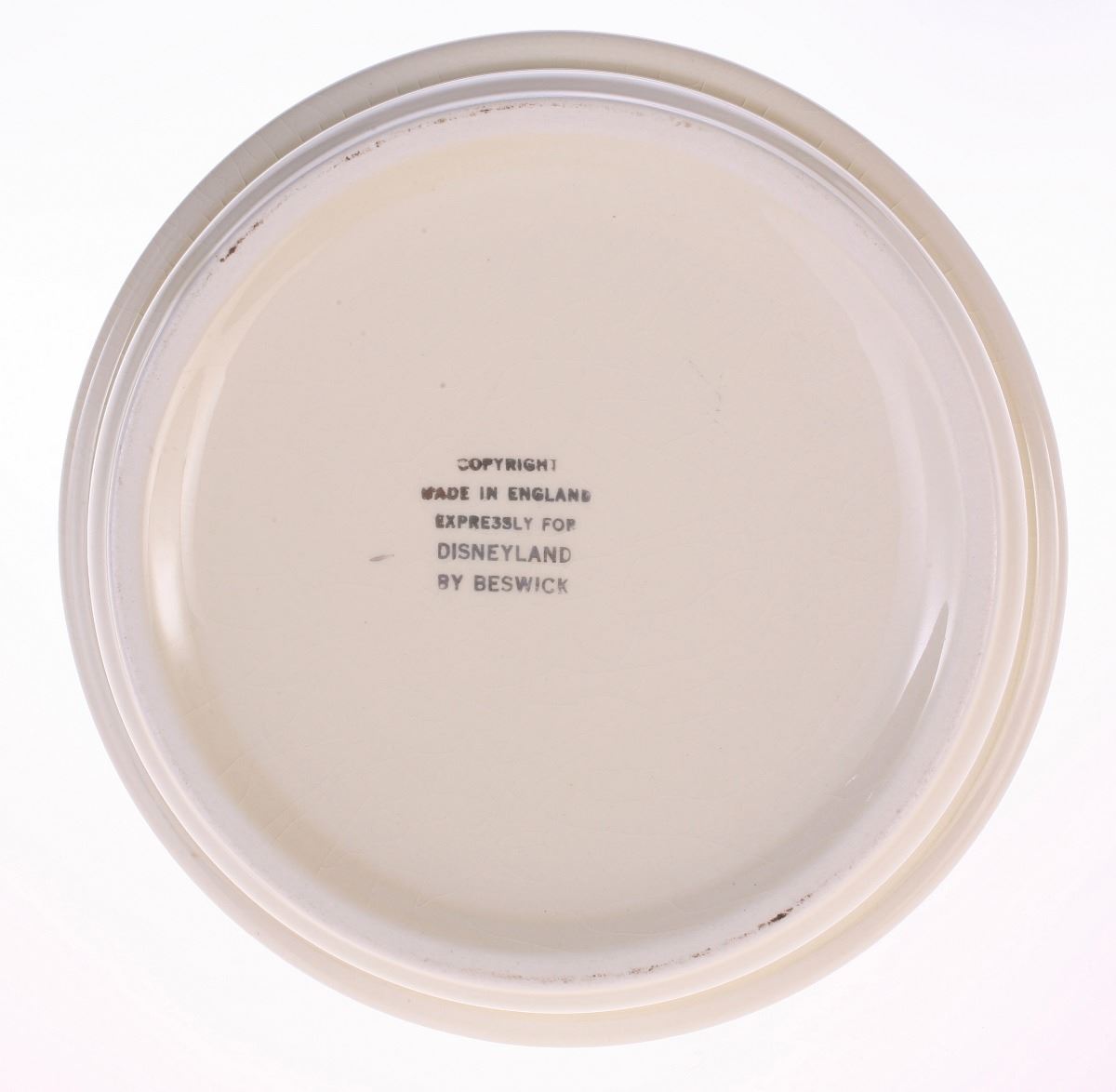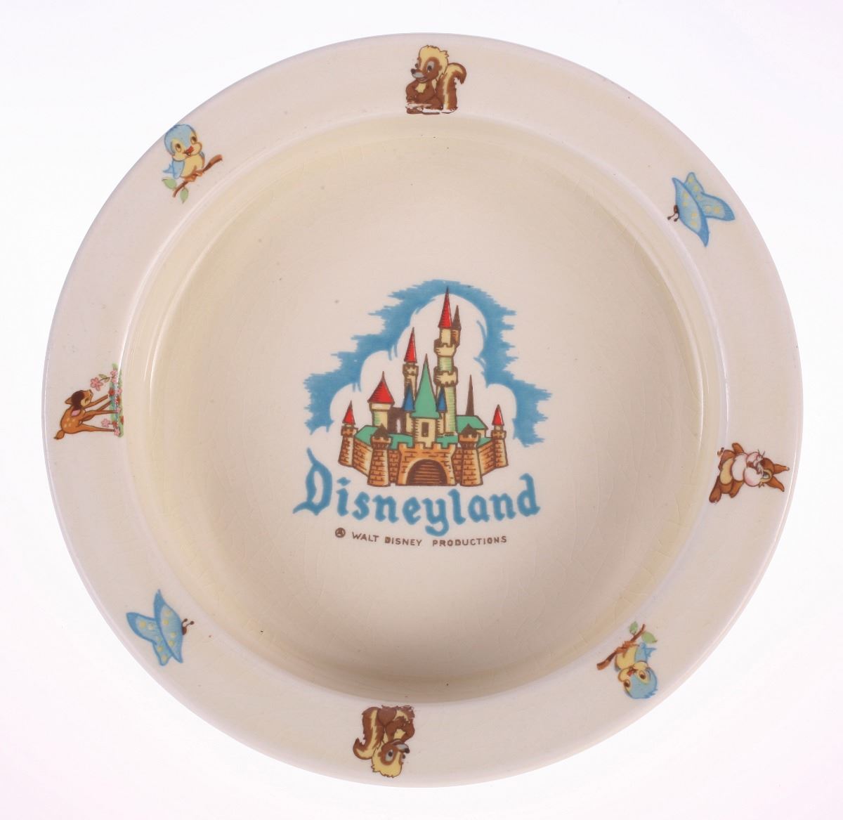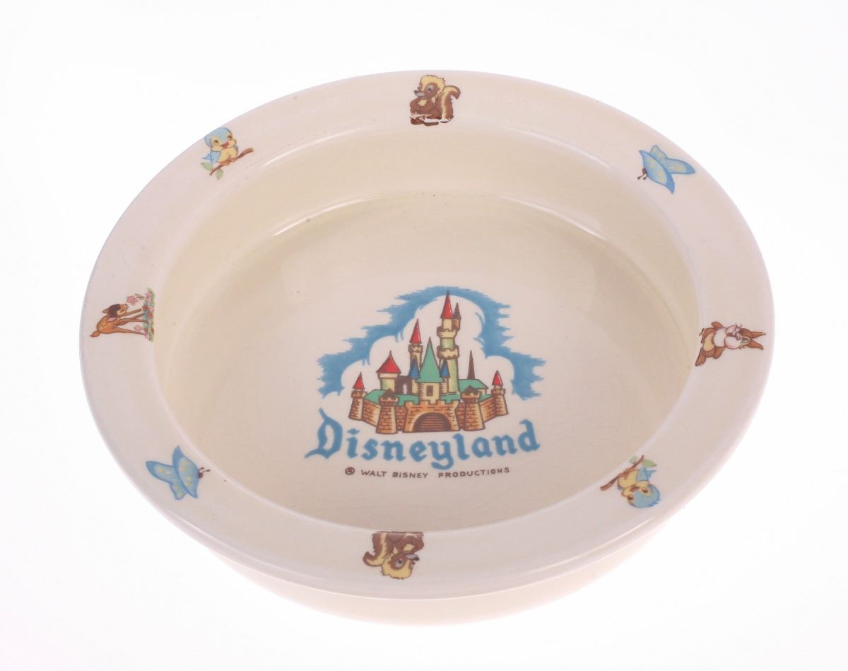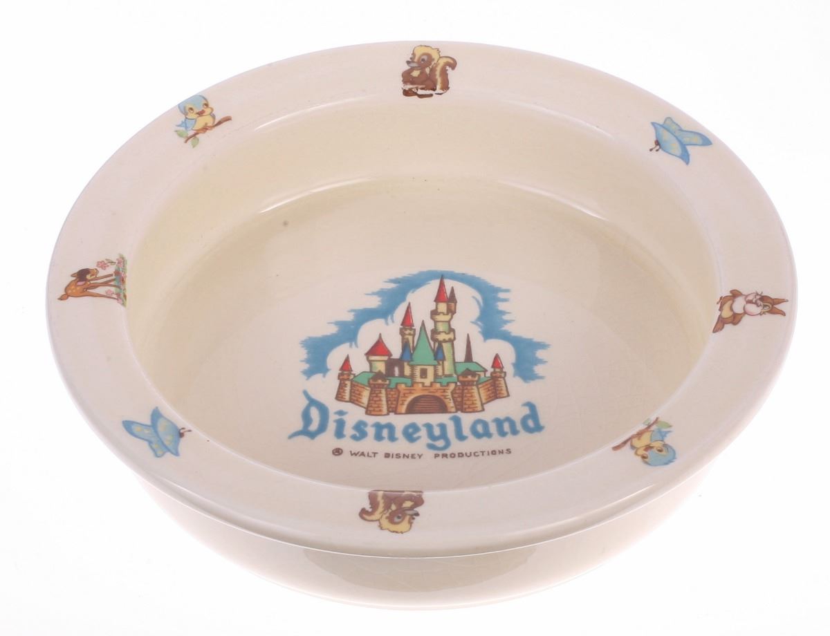 (Disneyland, 1950s) Ceramic baby bowl created by Beswick, featuring Disneyland Castle imagery in the center and Bambi-themed imagery around the rim. Base reads "Made in England Expressly for Disneyland by Beswick". Measures 6.4" in diameter and 1.5" tall. In good condition with minor wear to the base.