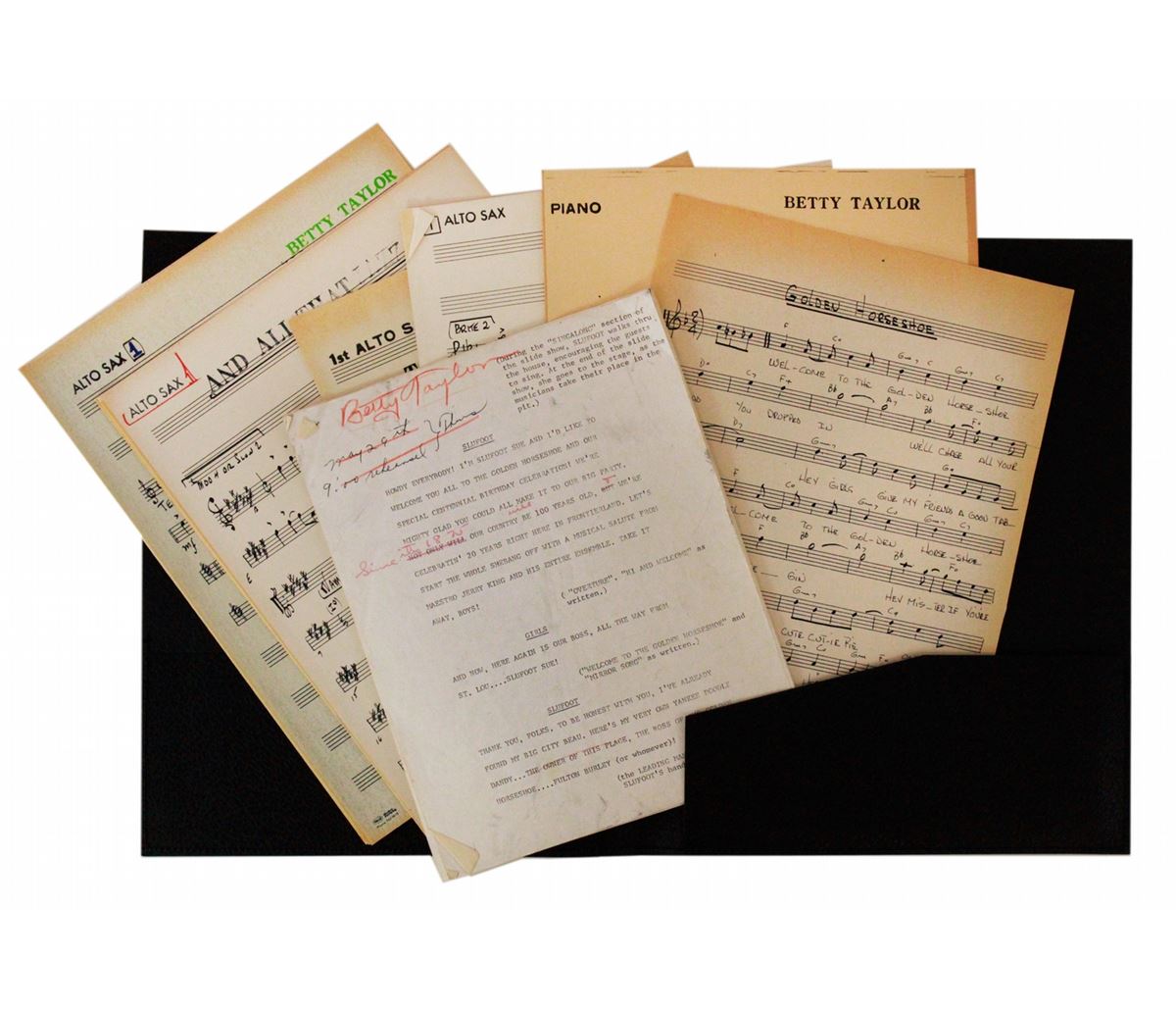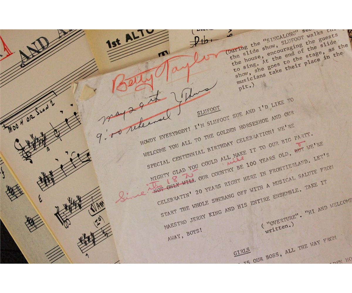 (Disneyland, 1960s) Betty Taylor’s, (Slue Foot Sue from 1956 till 1987) personal song folio for The Golden Horseshoe Revue. Includes sheet music and notes. Measuring 14 x 11 in. in very good condition with wear from use.