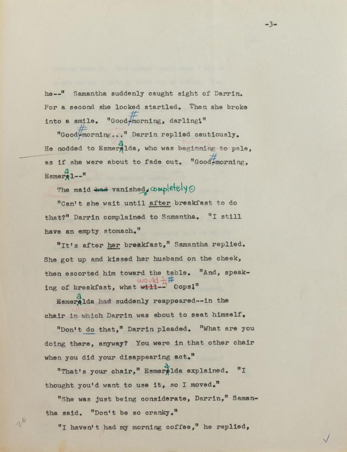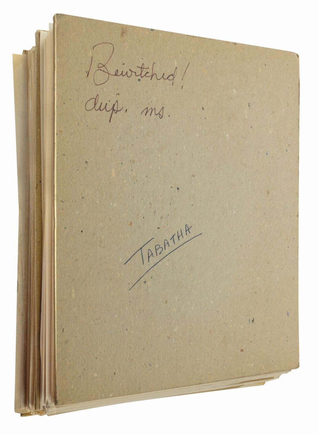 (Whitman, 1970) An original manuscript for the Bewitched television series tie-in novel, "Bewitched: The Opposite Uncle" by William Johnston. The 200-page typed manuscript is hand-annotated and copy edited in colored pencil and/or green ink on every page. This story of Darrin and Samantha Stephens is well regarded to this day by fans of the show. Measuring 11"x8.5", the manuscript is in very good condition. It exhibits some handling, marginal tears, and creases from the editing process, as well as minor browning from age.