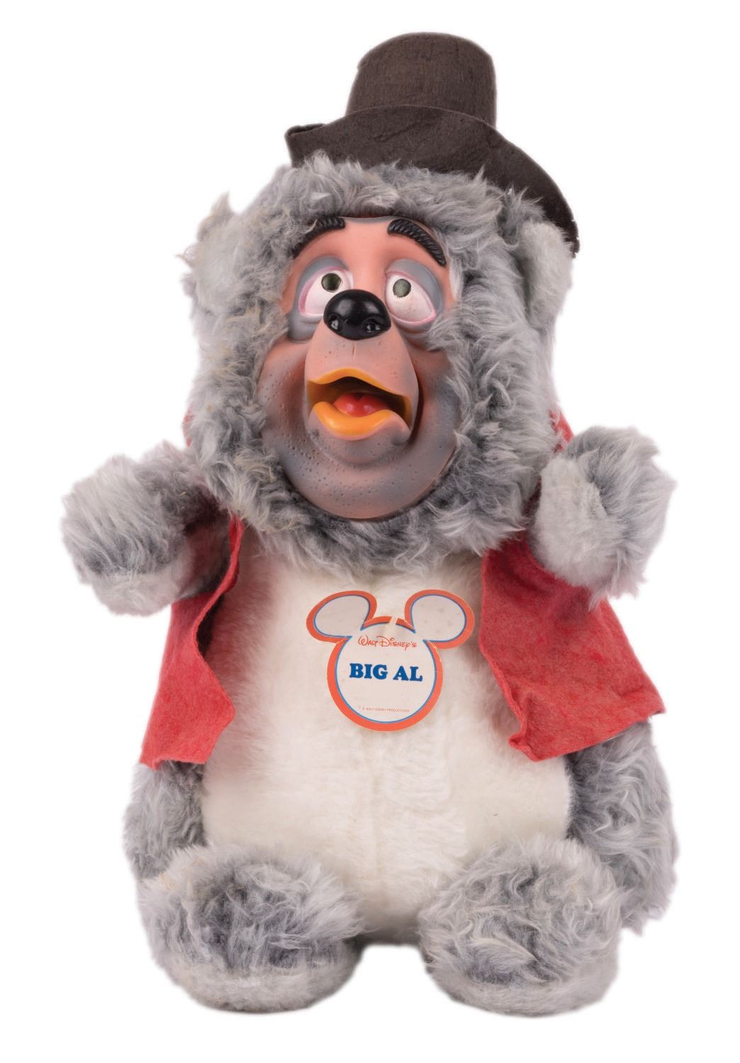 (Disneyland/Walt Disney World, 1970s) A Big Al character plush by California Stuffed Toys, inspired by the Country Bear Jamboree at Disneyland and The Magic Kingdom. Measuring 17" tall and 9.5" at its widest, the toy is in very good condition, with original Walt Disney Productions tag and price label, and light wear mainly to the felt hat.