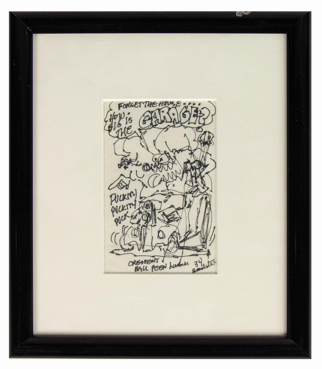 (Roth, c.1990s) An original concept drawing for a Rat Fink t-shirt by legendary car customizer and visual artist Ed "Big Daddy" Roth. The artwork depicts Roth's most famous creation, Rat Fink, riding in a hotrod with Mrs. Fink. A word bubble says, "Forget the House...How Big is the Garage?" Roth's hand-written notes add that Rat Fink is holding a crescent ball peen hammer and that the car is a 34 Roadster. This design would be slightly altered for the t-shirt as released. Accomplished in black ink on art paper with 5"x3" visible through a 10"x8" black lacquered wood frame. The artwork presents in fine condition.