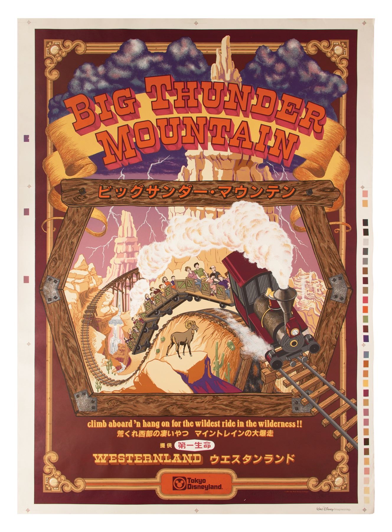 (Tokyo Disneyland, 1986) An original silkscreened attraction poster for the Big Thunder Mountain Railroad at Tokyo Disneyland. This rare poster was based on the designs of Imagineer Jim Michaelson, and was adapted by Leticia Lelevier and Greg Paul. Measuring 47"x33", the poster is in very good condition with minor edge wear.