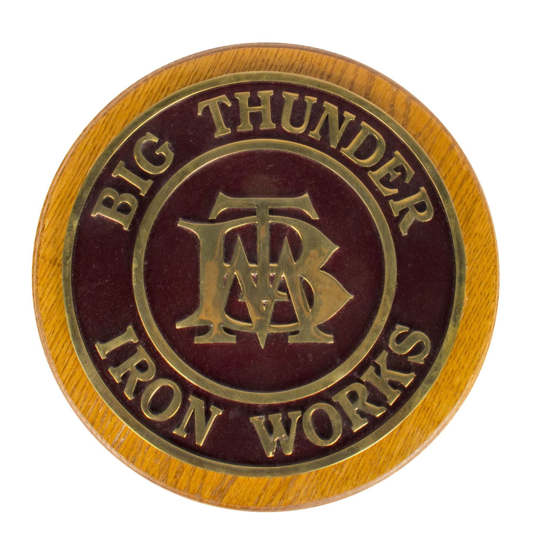 (Disneyland, c.2000s) A beautiful brass and wood replica of the boiler plates used on Disneyland's "Big Thunder Mountain Railroad". The boiler plate reads "Big Thunder Iron Works" and has the logo for the attraction in the center. This collector made replica measures 12" in diameter and is ready to hang on the wall. The condition is good with some wear to a few letters from use.