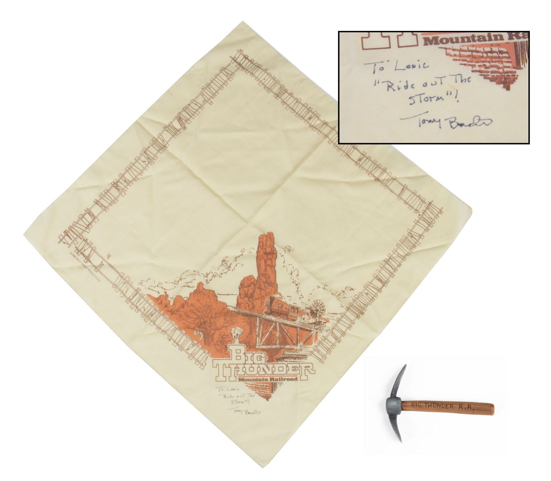(Disneyland, 1979) A very scarce pair of items from a cast member event for the opening of "Big Thunder Mountain Railroad" at Disneyland. The pair includes a small hand-painted resin pickaxe that reads "Big Thunder R.R." and "Disneyland '79" on the sides, as well as a small scarf featuring a stylish illustration of the attraction as well as a signature which reads "To Louie, 'Ride out the Storm'!" from Tony Baxter. The pickaxe measures 3" tall and the scarf measures approximately 22"x22". The pair is in very good condition with minor wear from age including a small chip in the tip of the pickaxe.