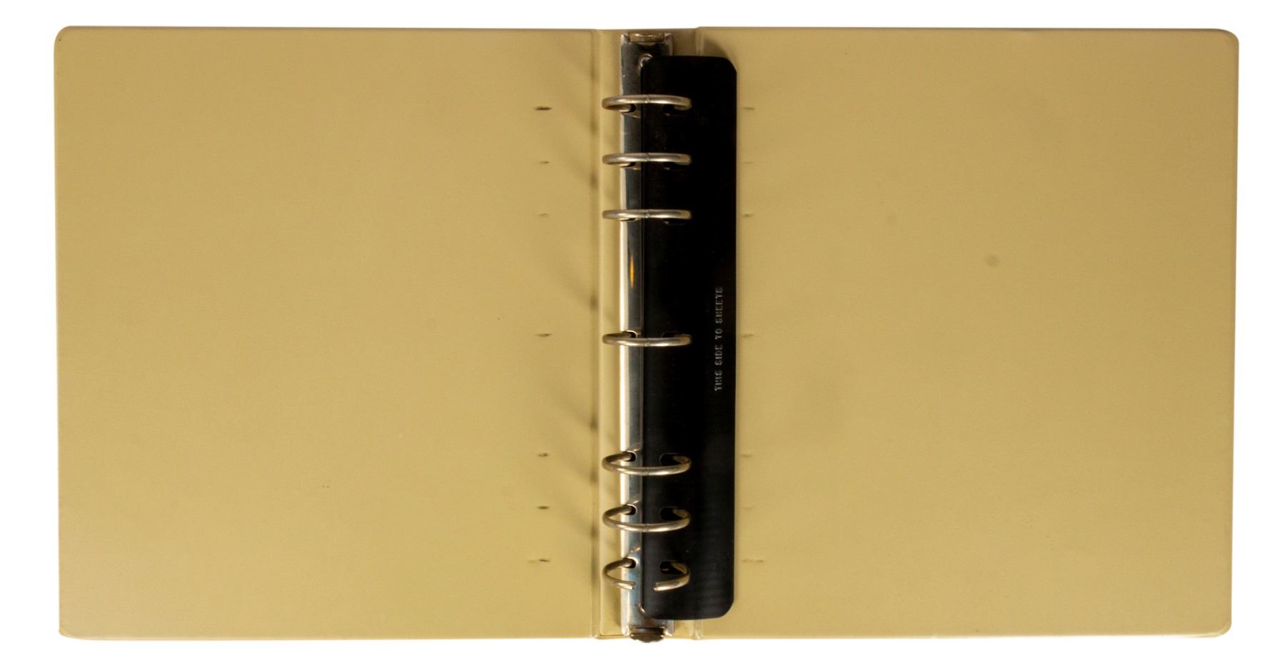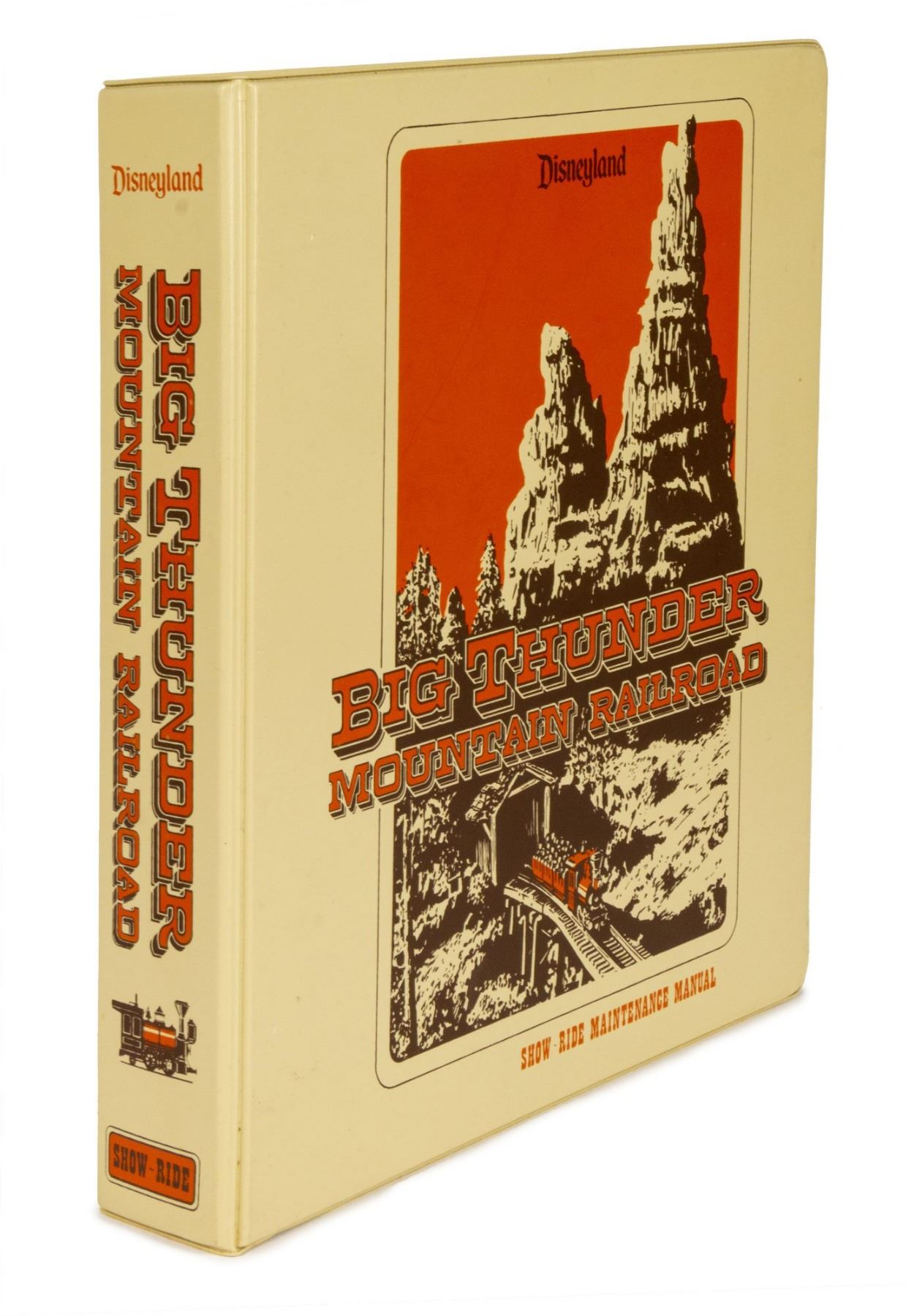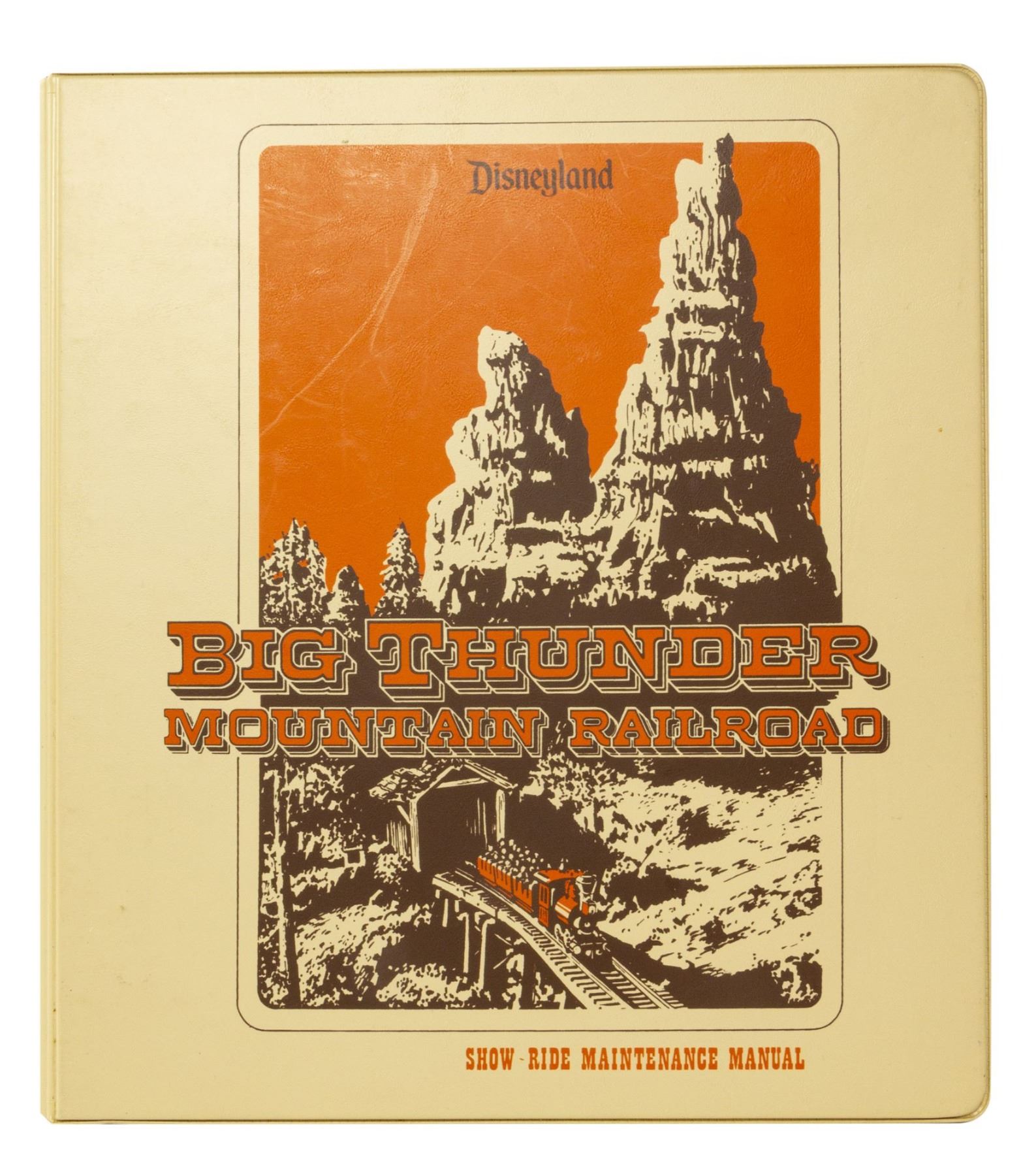 (Disneyland, c.1979-80) A binder for Big Thunder Mountain Railroad's Show-Ride Maintenance Manual. The manual material has been removed, but the cover still displays a beautiful image of the attraction in brown and orange print. Measuring 11.75"x10.5", the 7-ring binder is in good condition, with some wear to the cover and one non-functioning ring.