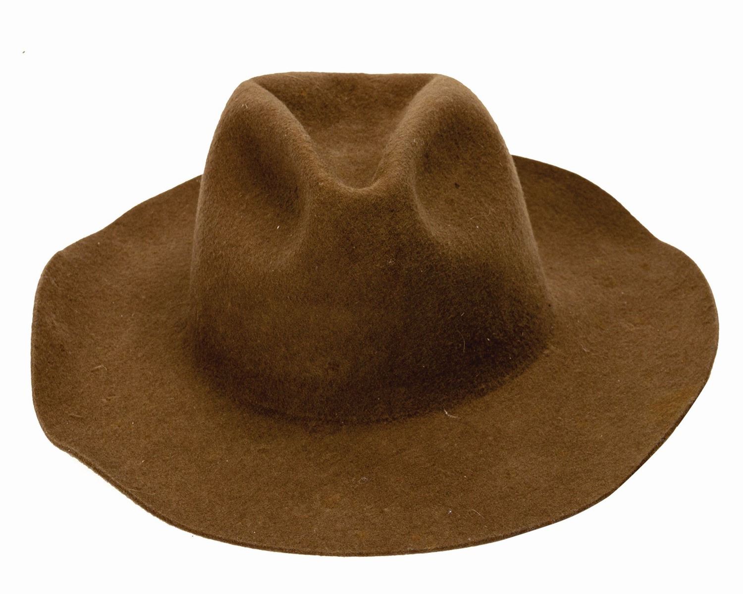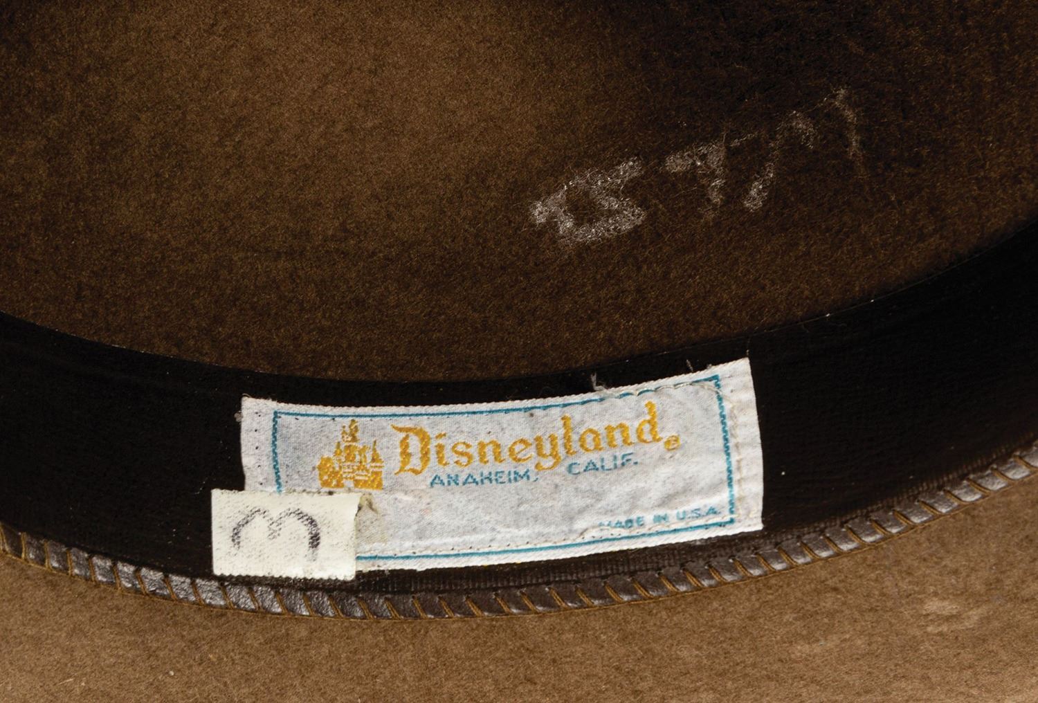 (Disneyland, c.1990s) A rare cast member Western-style fedora from Disneyland's Big Thunder Mountain Railroad. It retains an embroidered Disneyland wardrobe label and a piece of tape marked size "M." The hat is additionally marked in white on either side of the interior crown "BTM." In very good condition, the hat is missing its hatband and exhibits tiny holes from its former attachment, some general wear from use, and a darker spot on the rear crown.