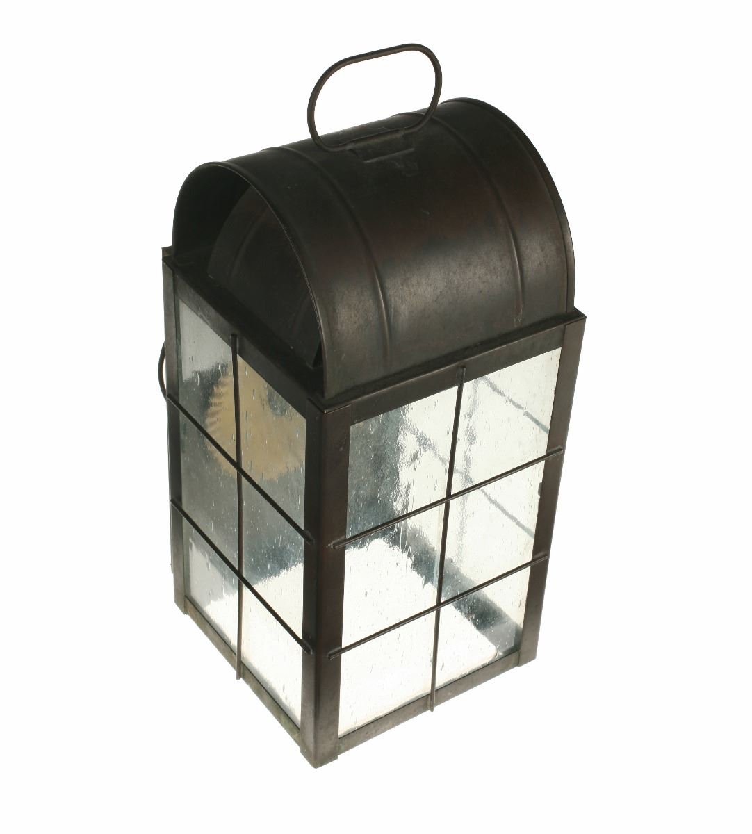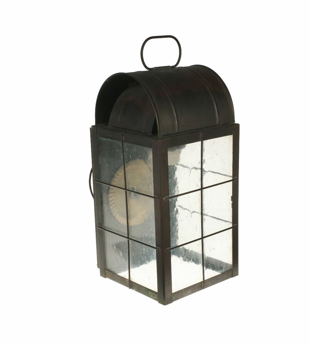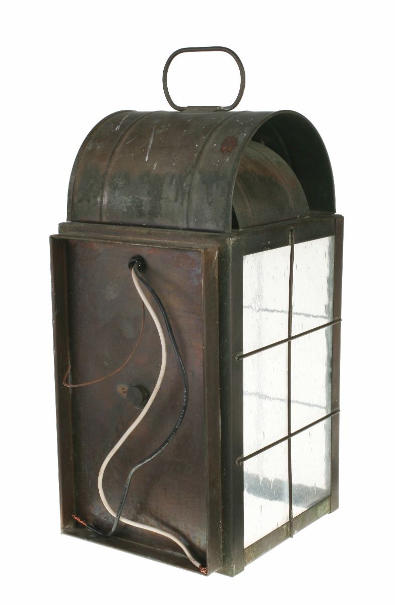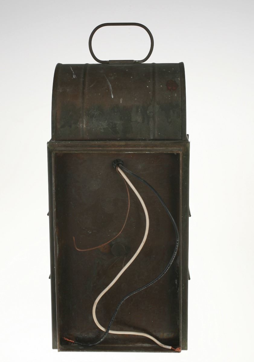 (Disneyland, 1980s) Large lantern used in the queue and preshow area of the "Big Thunder Mountain Railroad" attraction. The metal and glass lantern was removed during refurbishment of the ride in 2013. Measures 9"x8.5"x16". In very good condition with expected wear from exposure and use.