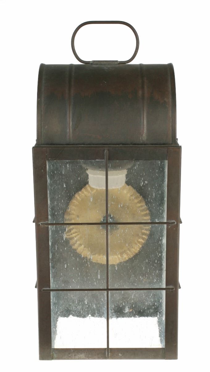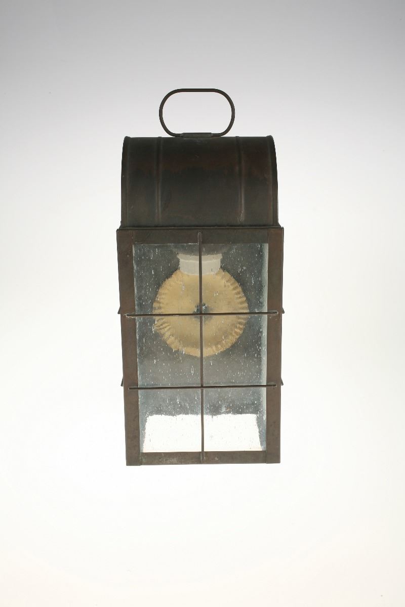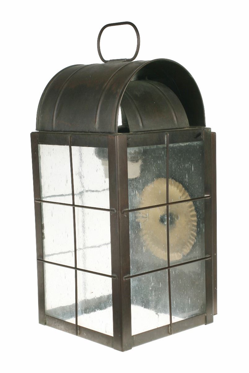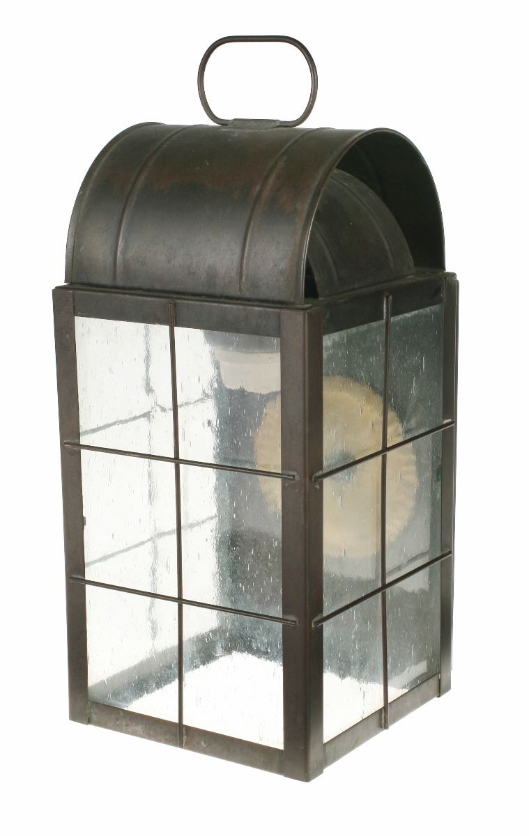 (Disneyland, 1980s) Large lantern used in the queue and preshow area of the "Big Thunder Mountain Railroad" attraction. The metal and glass lantern was removed during refurbishment of the ride in 2013. Measures 9"x8.5"x16". In very good condition with expected wear from exposure and use.