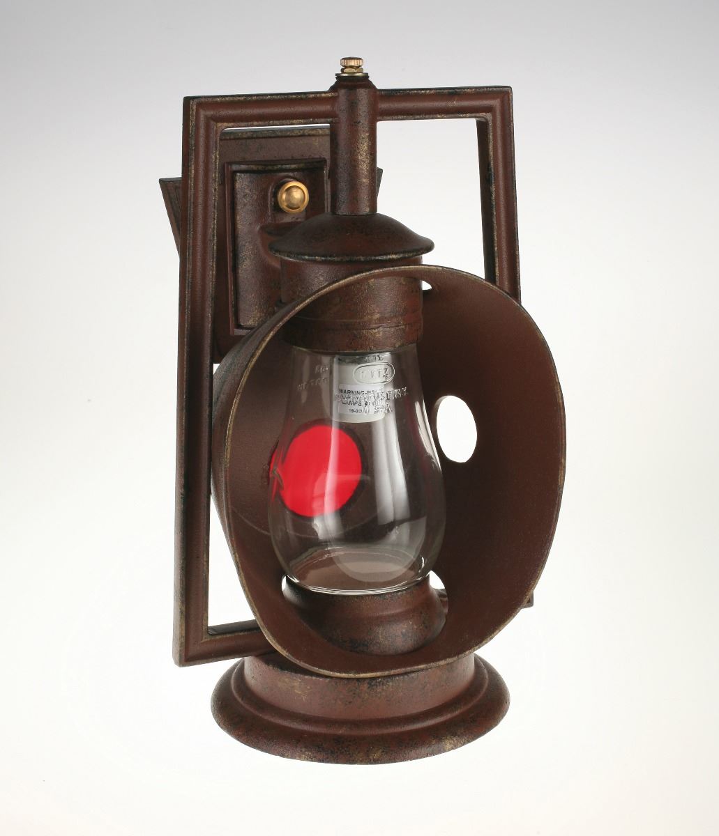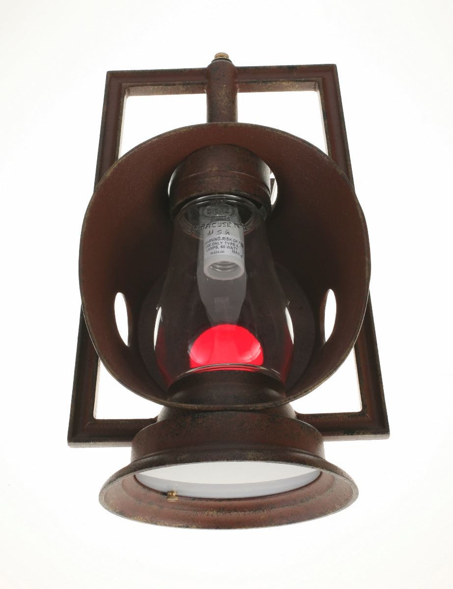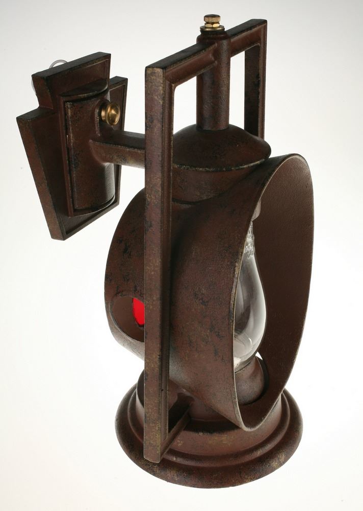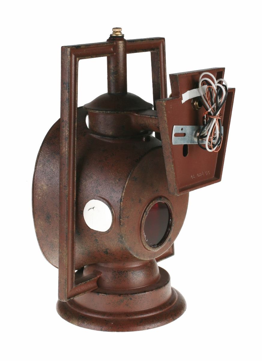 (Disneyland, 1980s) Western style lantern used in the queue and preshow area of the "Big Thunder Mountain Railroad" attraction. The metal and glass lantern was removed during refurbishment of the ride in 2013. Measures 5.5"x5.5"x13". In very good condition with expected wear from exposure and use.