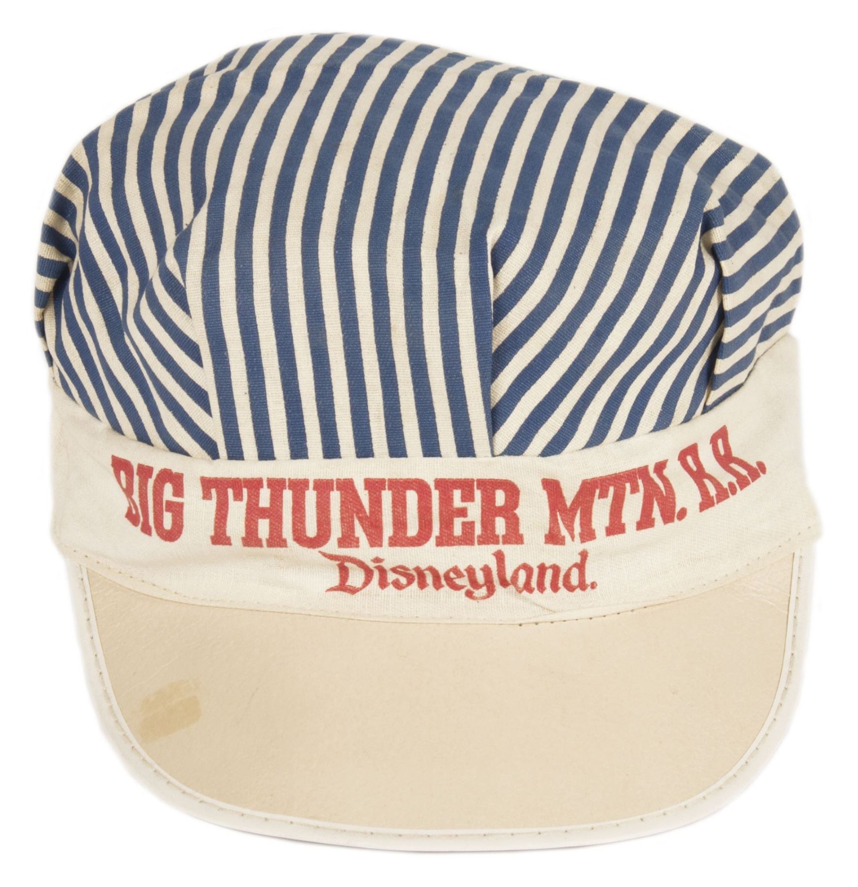 (Disneyland, c.1980) A souvenir striped hat promoting Big Thunder Mountain Railroad. This hat has the name of the attraction on the front and is patterned after vintage railroad conductor hats. The hat is a size large and is in good condition with some wear from use and some slight discoloration on the brim.