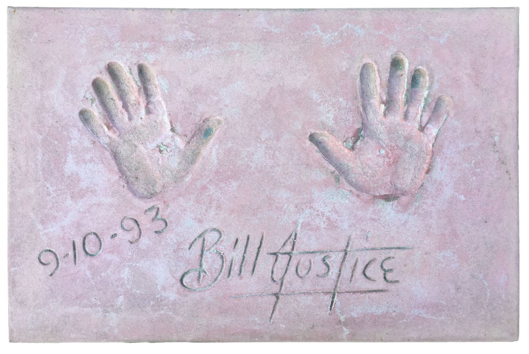 (Walt Disney Studios, 1993) A cement block containing the handprints and signature of Disney Legend Bill Justice. Hired at the Walt Disney Studios in 1937, Justice animated on such memorable films as Fantasia, The Three Caballeros, Alice in Wonderland, Peter Pan, and many others. Justice also directed the popular Mickey Mouse March on the 1950s Mickey Mouse Club television show, and had a significant career within Imagineering working on Audio-Animatronics for Disneyland attractions. This cement imprint of Justice's hands and his signature within the cement provide a lasting reminder of his artistry and contributions to The Walt Disney Studios. Dated 9-10-93, the cement measures approximately 18"x27" and 3" deep. The condition is very good with minor surface wear from previous display.