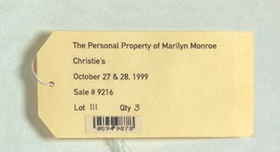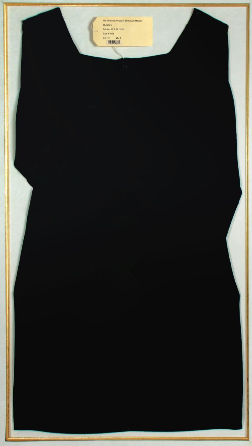 (Monroe, c.1950s) A black dress from the estate of Marilyn Monroe. The dress was originally sold in the 1999 Christie's sale of her collection. The long-sleeved zipper-backed dress is framed with (6) images of Monroe in various black dresses, along with (3) tags from the auction, an image of the catalog cover, and a plaque. The stunning display measures 54.5"x45.5" within its custom frame. The condition is very good, with some wear to the frame from previous display. This item may require special shipping arrangements, please inquire for details and estimates.