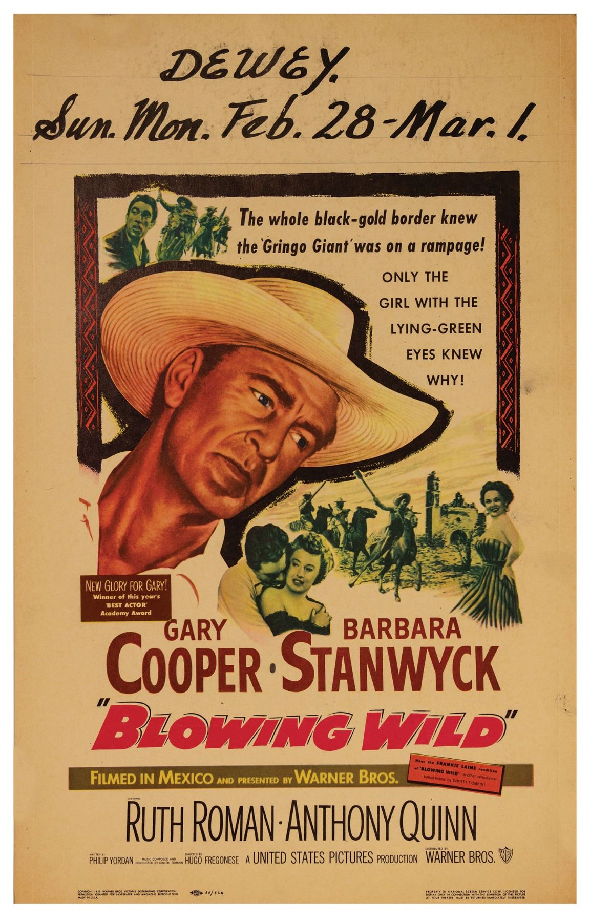 (Warner Bros., 1954) A rare window card from the drama film, Blowing Wild starring Gary Cooper. Measuring 22"x14", the window card is in good condition with minor wear and discoloration from its original use, as well as a few staple marks and wear around the edges. The dates the film was playing at its theater are written along the top-edge.