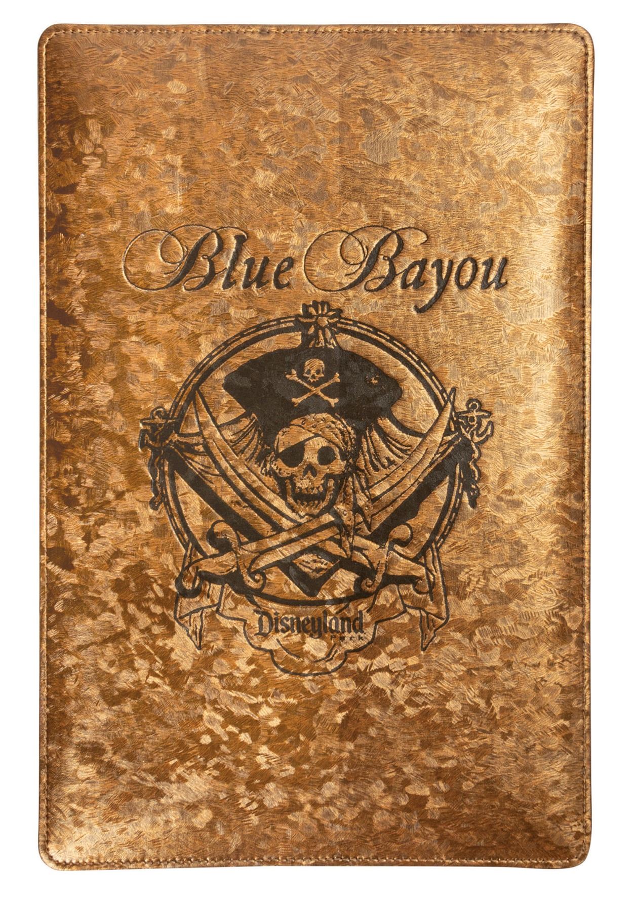 (Disneyland, c.2000s) A gorgeous menu holder from the Blue Bayou restaurant located inside the Pirates of the Caribbean attraction at Disneyland. The menu holder features the name of the restaurant above Pirates imagery with "Disneyland Park" written below it. The imagery is embossed over a shimmering copper-colored finish. Measuring 17.5"x11.5", the menu holder is in very good condition with minor surface wear from use.