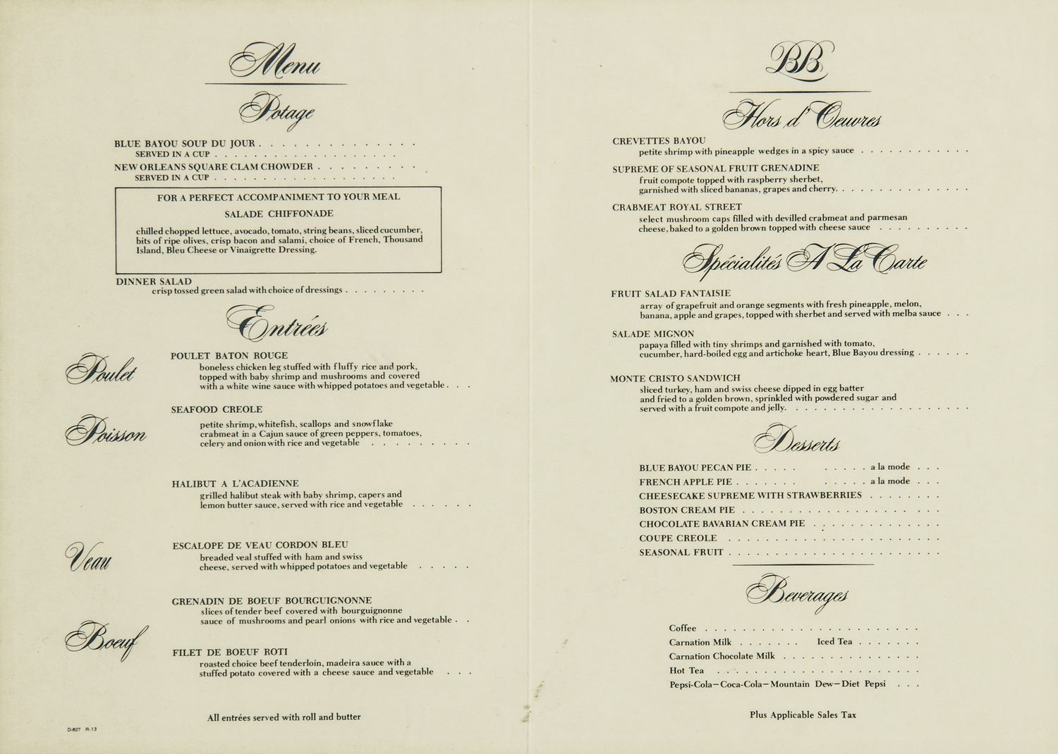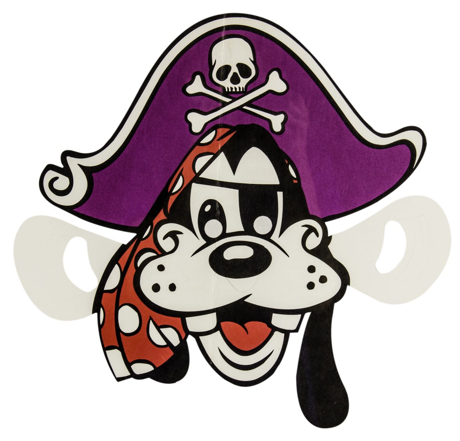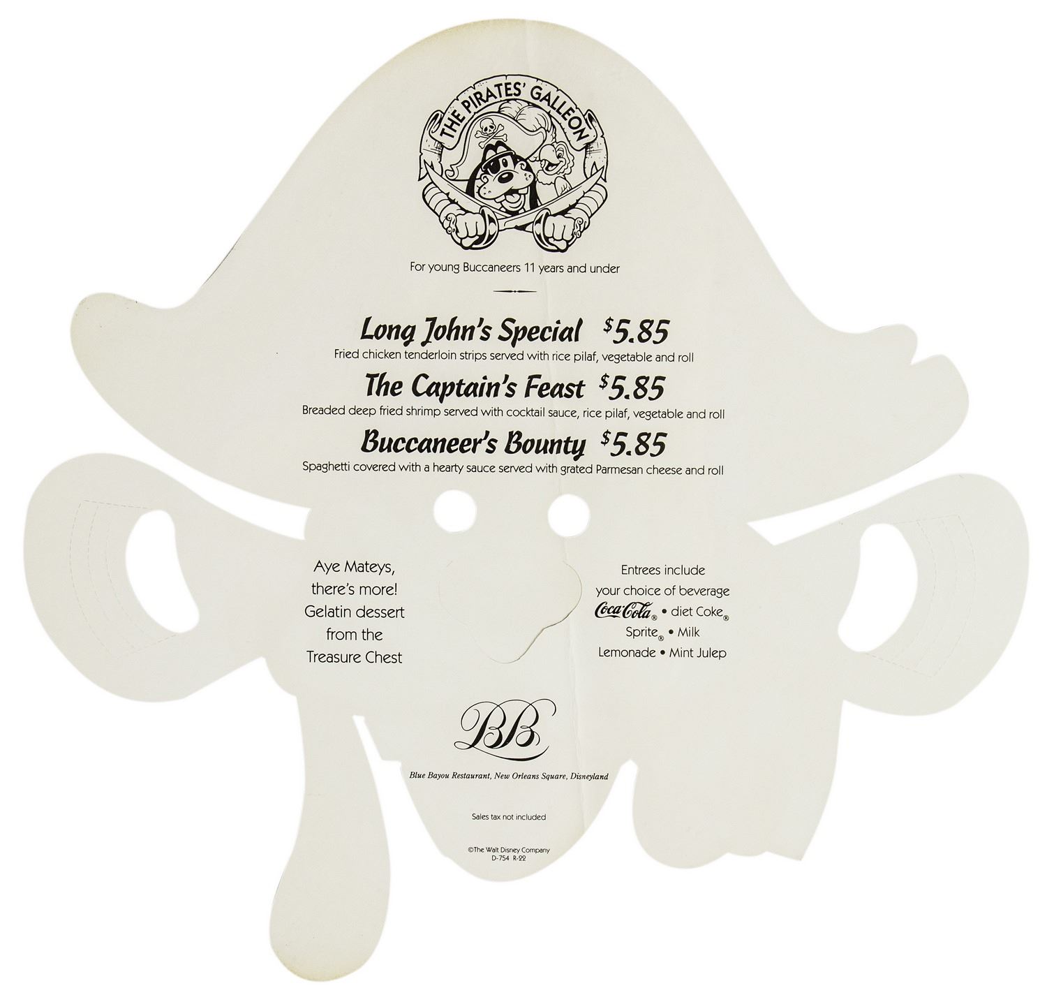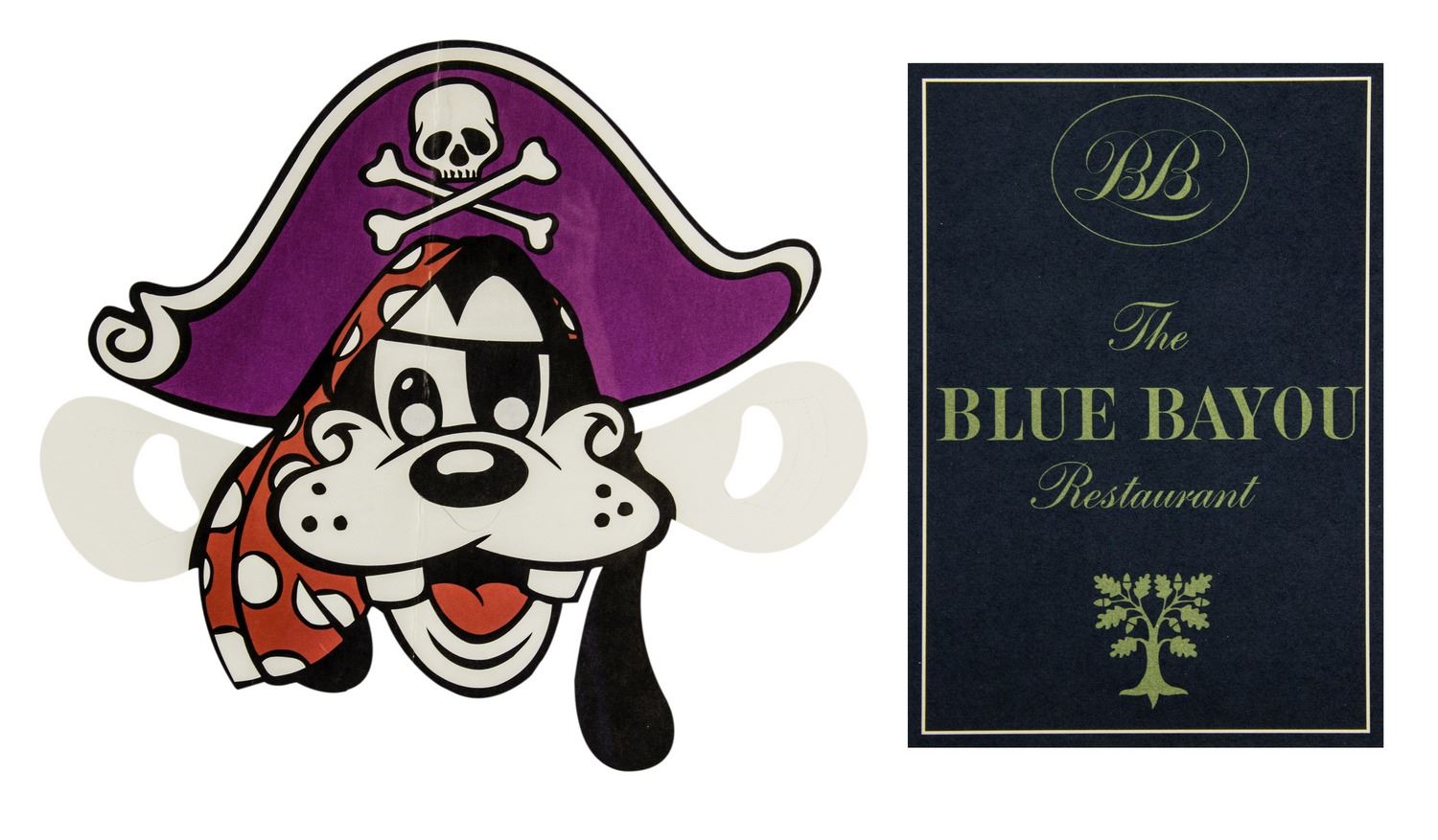 (Disneyland, c.1970s-80s) A pair of souvenir menus from the Blue Bayou restaurant at Disneyland. This pair includes a menu which tells the story of the Blue Bayou on the back, and a child's menu which doubles as a Pirate Goofy mask. The mask measures 13"x13.5" while the smaller menu measures 6.5"x4.5". Both items are in good condition, with some edge-wear and a crease down the center of the mask.