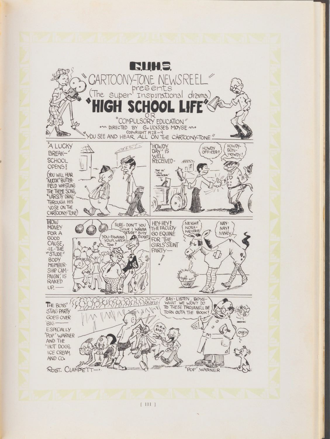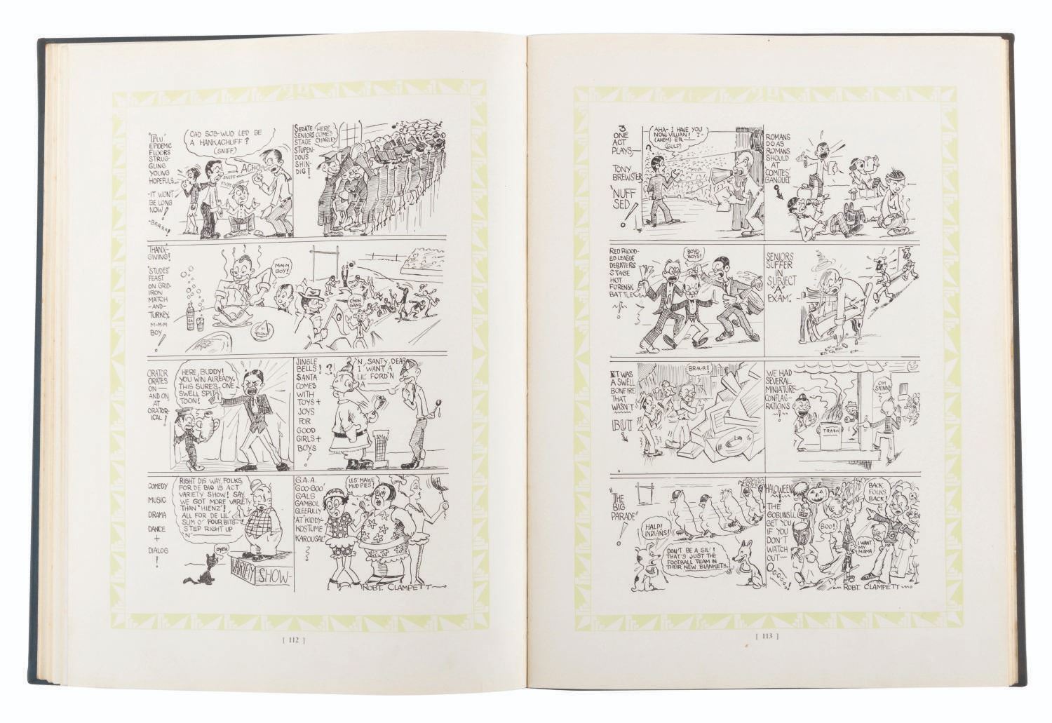 (Clampett, 1929) Bob Clampett's personal copy of his 1929 Glendale Union High School Yearbook. As a junior and a well-established artist at the school, several pages of his artwork appear in the book. Measuring 10.75" x 8", the book is in very good condition with expected wear from age.