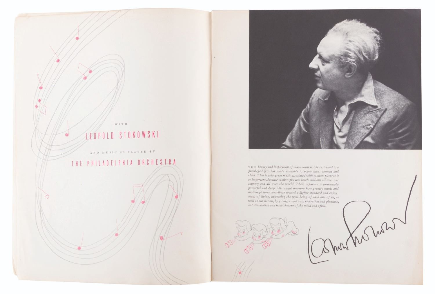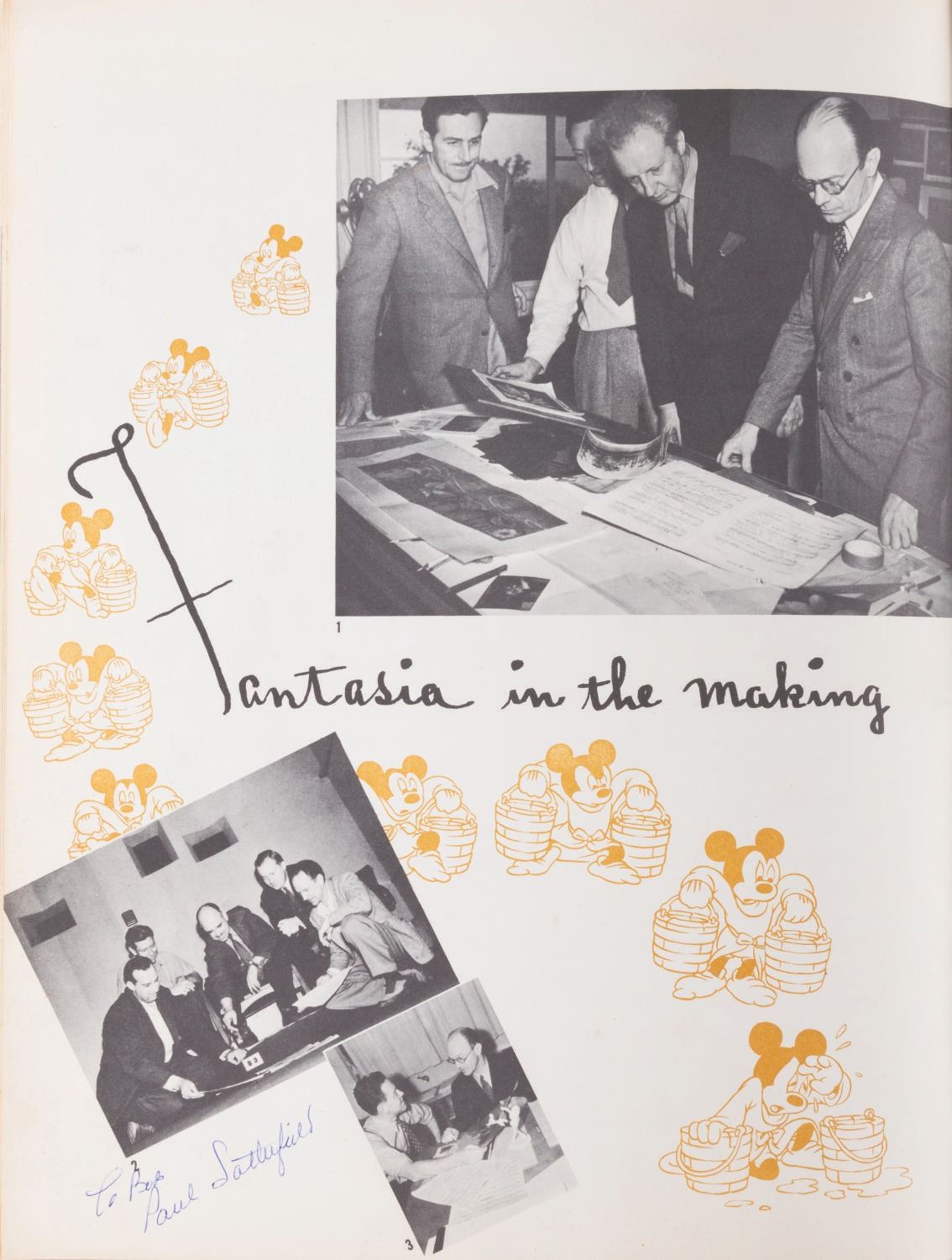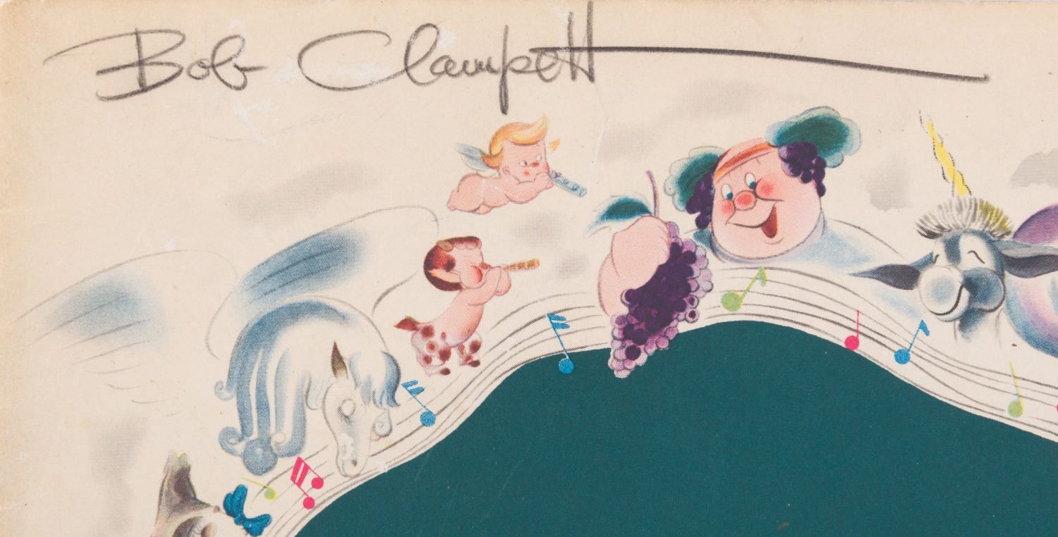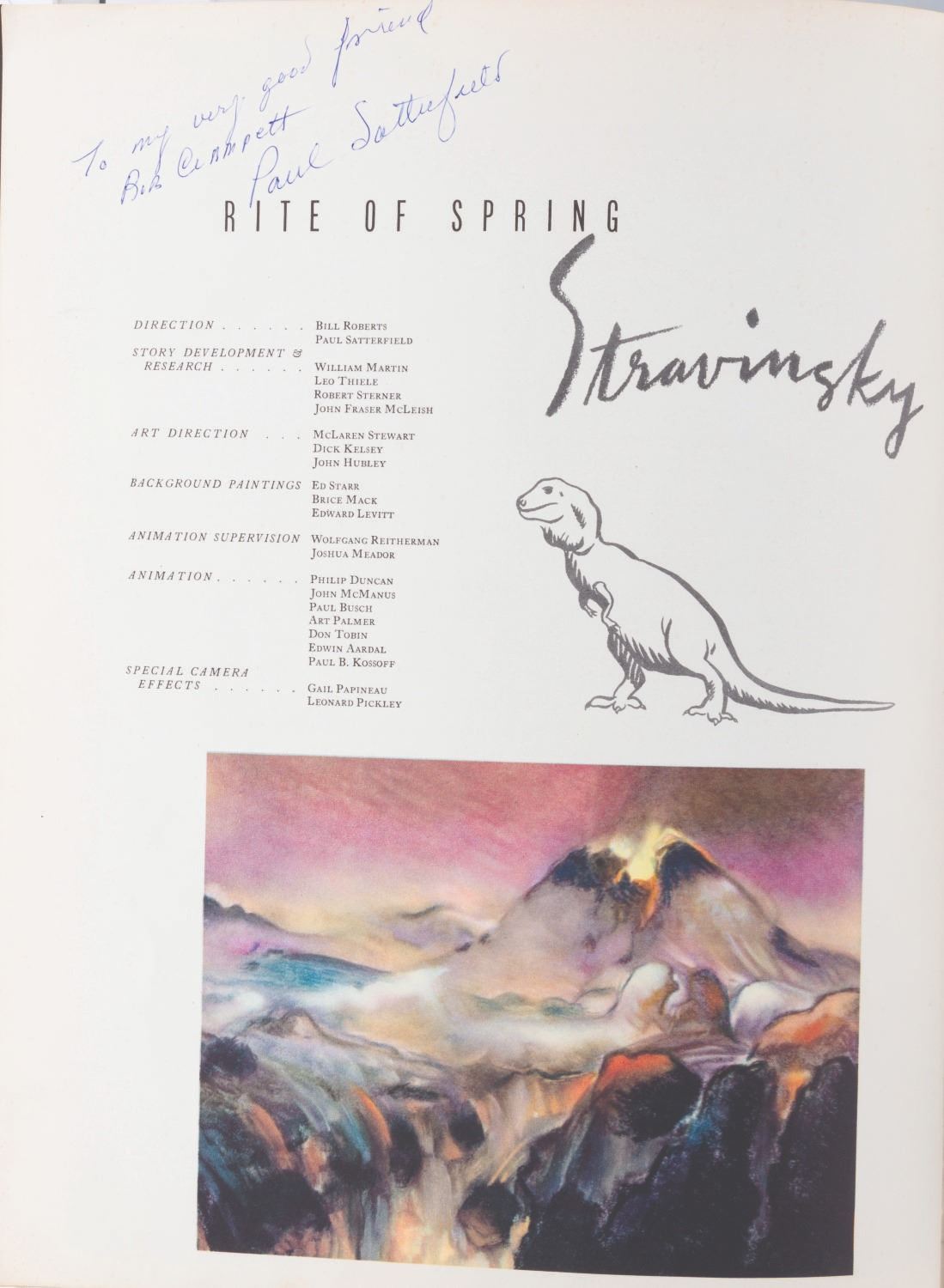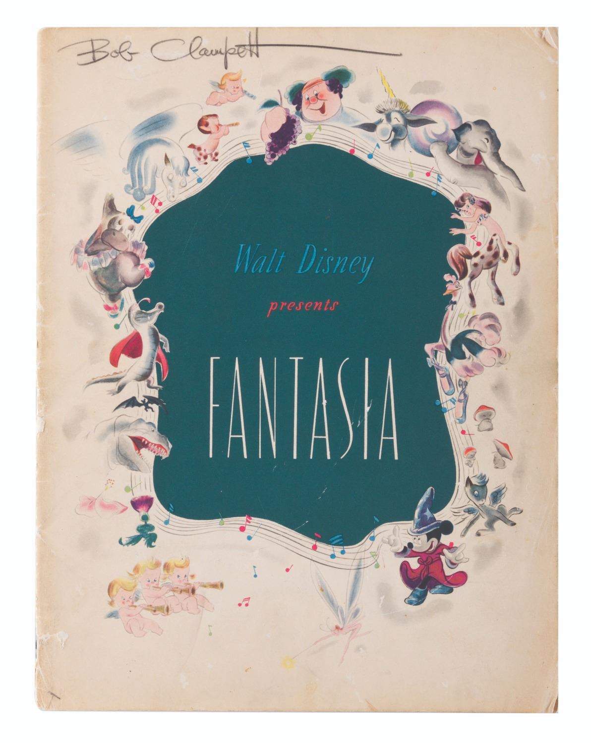 (Disney, 1940) An original Walt Disney’s “Fantasia” program created for the film’s initial theatrical release. The 28-page program features extensive behind-the-scenes information and background notes on each of the film’s segments, and is illustrated throughout with set and studio photography, as well as concept art. Bob Clampett signed this personal copy of his on the cover, and it is signed to Bob in two different places by Paul Satterfield, Director of the “Rite of Spring” segment. Measuring 9.5” x 12.5”, the book is in good condition with wear handling including soiling and creasing to edges, and small tears and creases to the spine with a 1.5” split at the bottom.