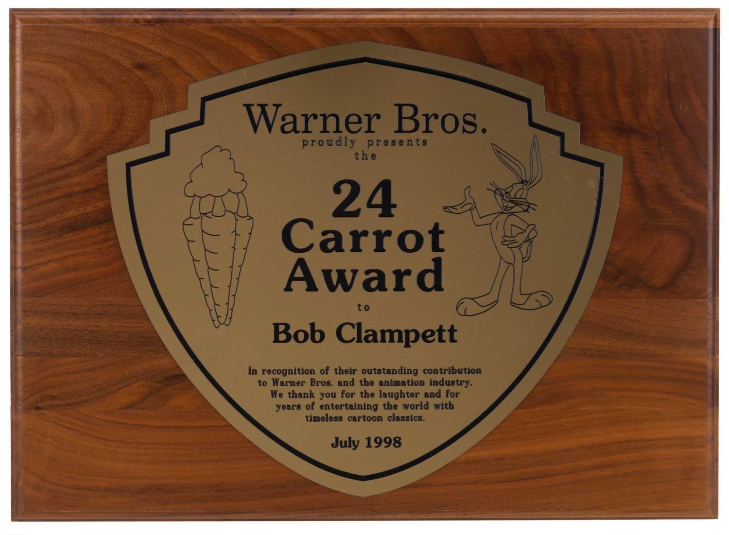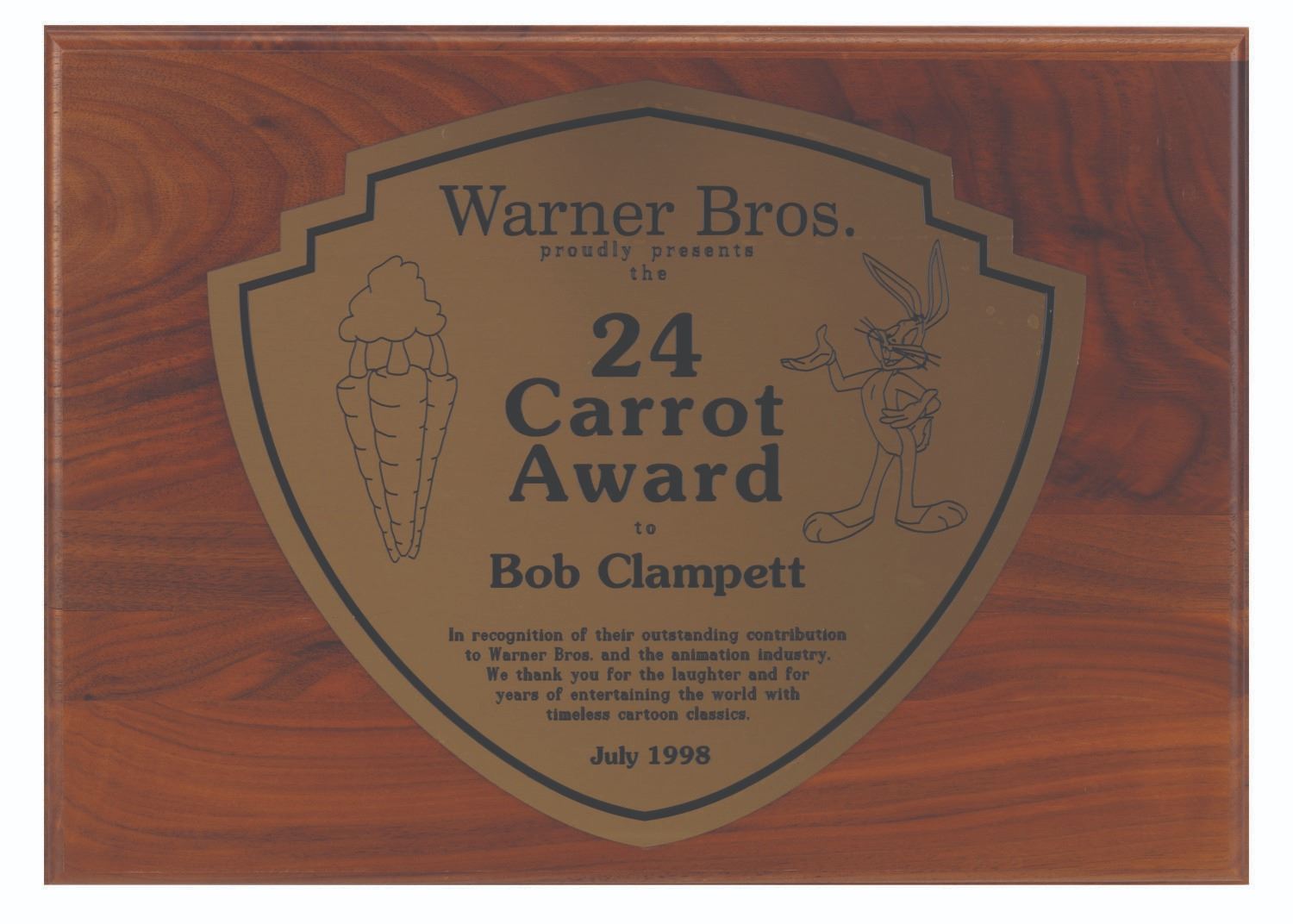 (Warner Bros., 1998) The 24 Carrot Award given to Bob Clampett for his contributions to the studio and impact on the animation industry. There are very few who have received this award, including Chuck Jones, Stan Freberg, and Willie Ito. Comprised of a gold plaque measuring 9.75” x 10.75” on a 11” x 15” wooden plaque, the award is in good condition with scratches, scuffs, and wear.
