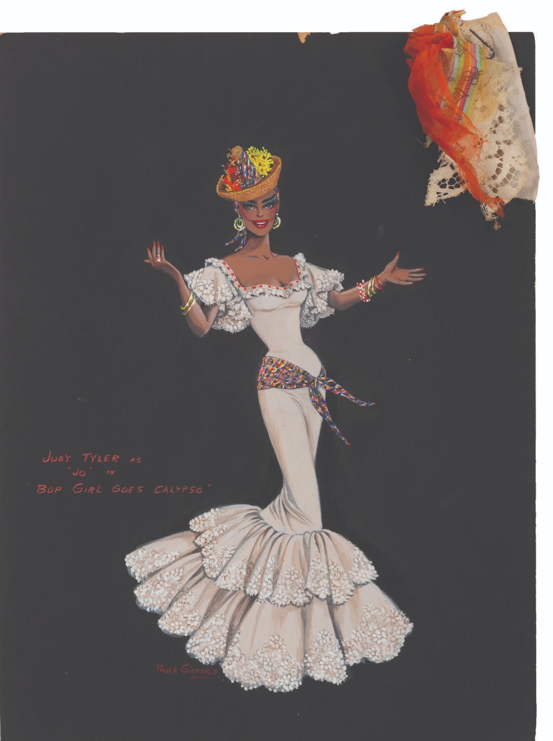 (United Artists, 1957) A costume concept for Judy Tyler as Jo in the film"Bop Girl Goes Calypso", with attached fabric swatches. The design was executed in gouache by Costume Designer Paula Giokaris, who signed the art. Measuring 15"x20", the concept art is in good production-used condition, with light wear to the edges including a .5" chip at top center.