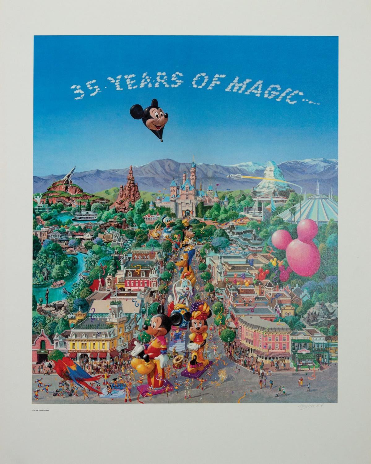 (Disneyland, 1990) A beautiful lithograph by Charles Boyer that was created to commemorate the 35th anniversary of Disneyland. Titled "35 Years of Magic," this lithograph is an artist's proof, and is signed by Boyer and marked as an "AP" in pencil. The 30"x24" lithograph is in very good condition with minor handling wear.