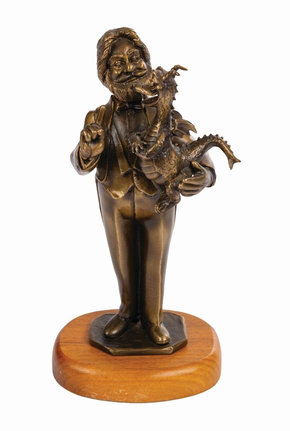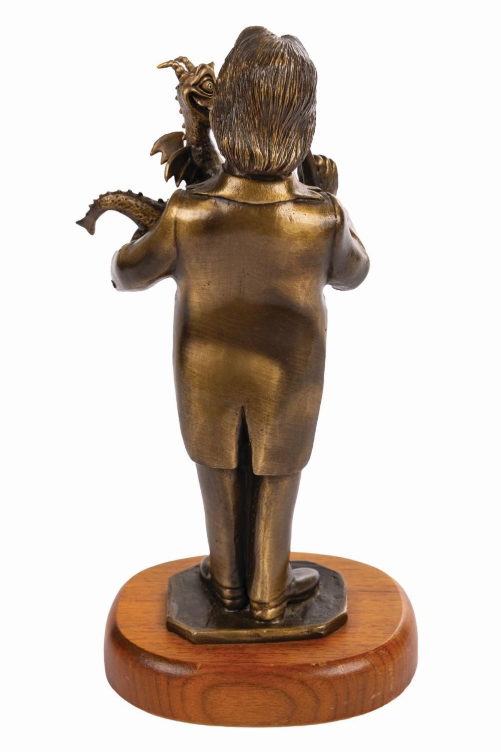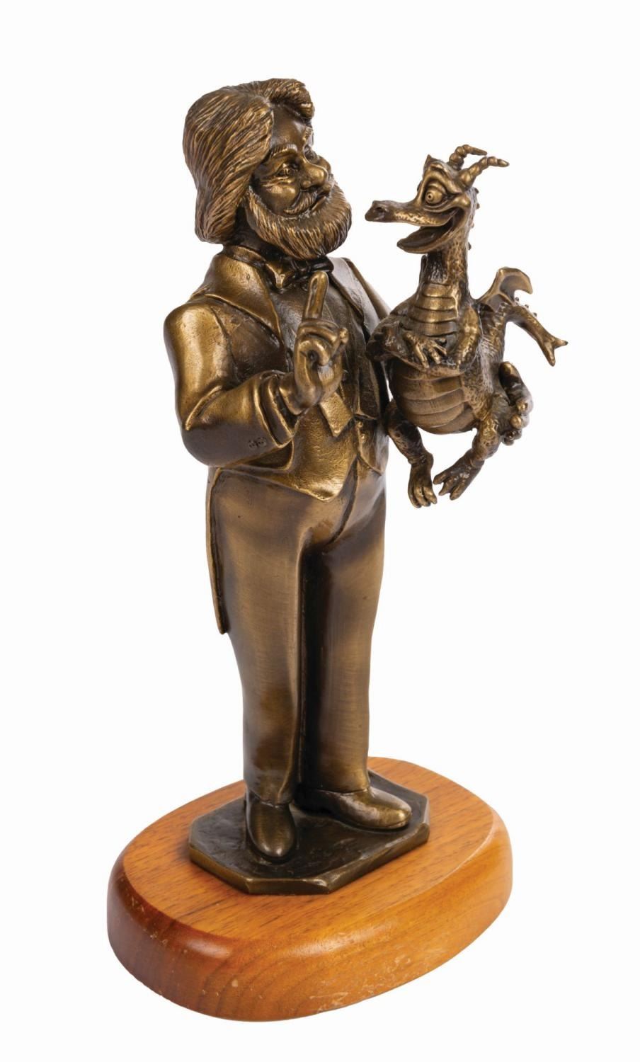 (Epcot, 1980s) A rare bronze sculpture created by renowned sculptor and Disney artist, Bill Toma. Depicting Dreamfinder and Figment from Journey into Imagination, the sculpture was only offered during the early years of Epcot and surviving examples are difficult to find. The sculpture stands 8.5" tall, including its wooden base, and is in very fine condition with little surface wear from previous display, including a few small scuffs to the wooden base. There is a Walt Disney Productions copyright mark at the back of Dreamfinder's pant leg.