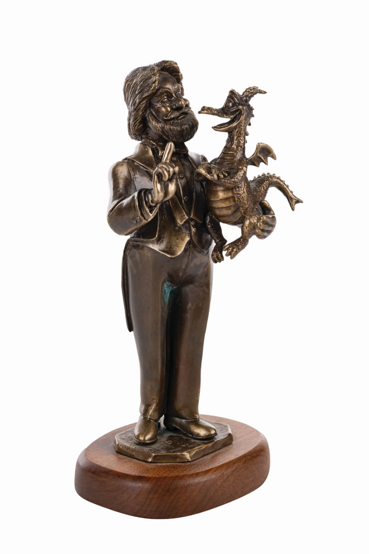(Epcot, 1980s) A bronze sculpture of Dreamfinder and Figment created by renowned sculptor and Disney artist Bill Toma. Depicting the stars of Journey into Imagination, the sculpture was only offered during the early years of Epcot and surviving examples are difficult to find. The sculpture stands 8.5" tall, including its wooden base, and despite minor oxidation to the tails, is in fine condition.