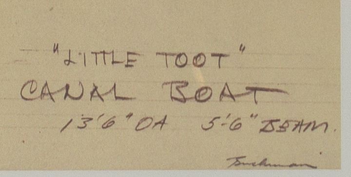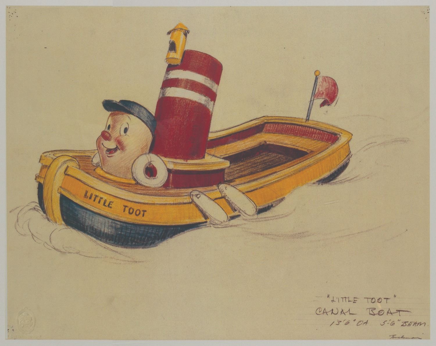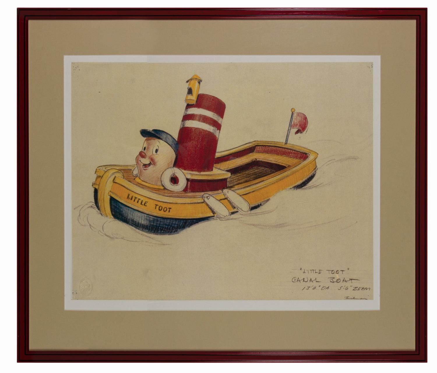 (Disneyland, c.1980s) A limited edition Disney Gallery lithographic print of Little Toot Canal Boat concept art by Imagineer Bruce Bushman. The print retains a debossed Disneyland Gallery stamp at lower right and is hand-numbered in pencil at lower left, "60/300." Measuring 20"x25" within a 29"x32.5" red molded wood frame with black stripe accents, the piece appears to be in fine condition with only minor wear to the frame.