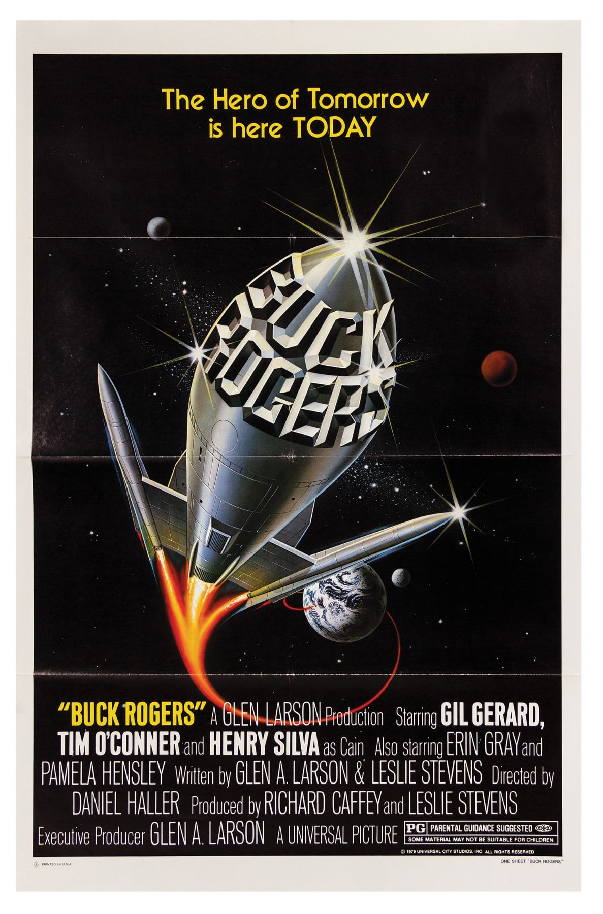 (Universal, 1979) A rare one sheet teaser poster for Buck Rogers in the 25th Century. Following the success of Star Wars in 1977, Universal planned to develop Buck Rogers as a series of television films. The series first film was then adapted as a theatrical release, for which this teaser poster was created. Measuring 41"x27", this poster is in good condition with minor wear to the original fold-lines.
