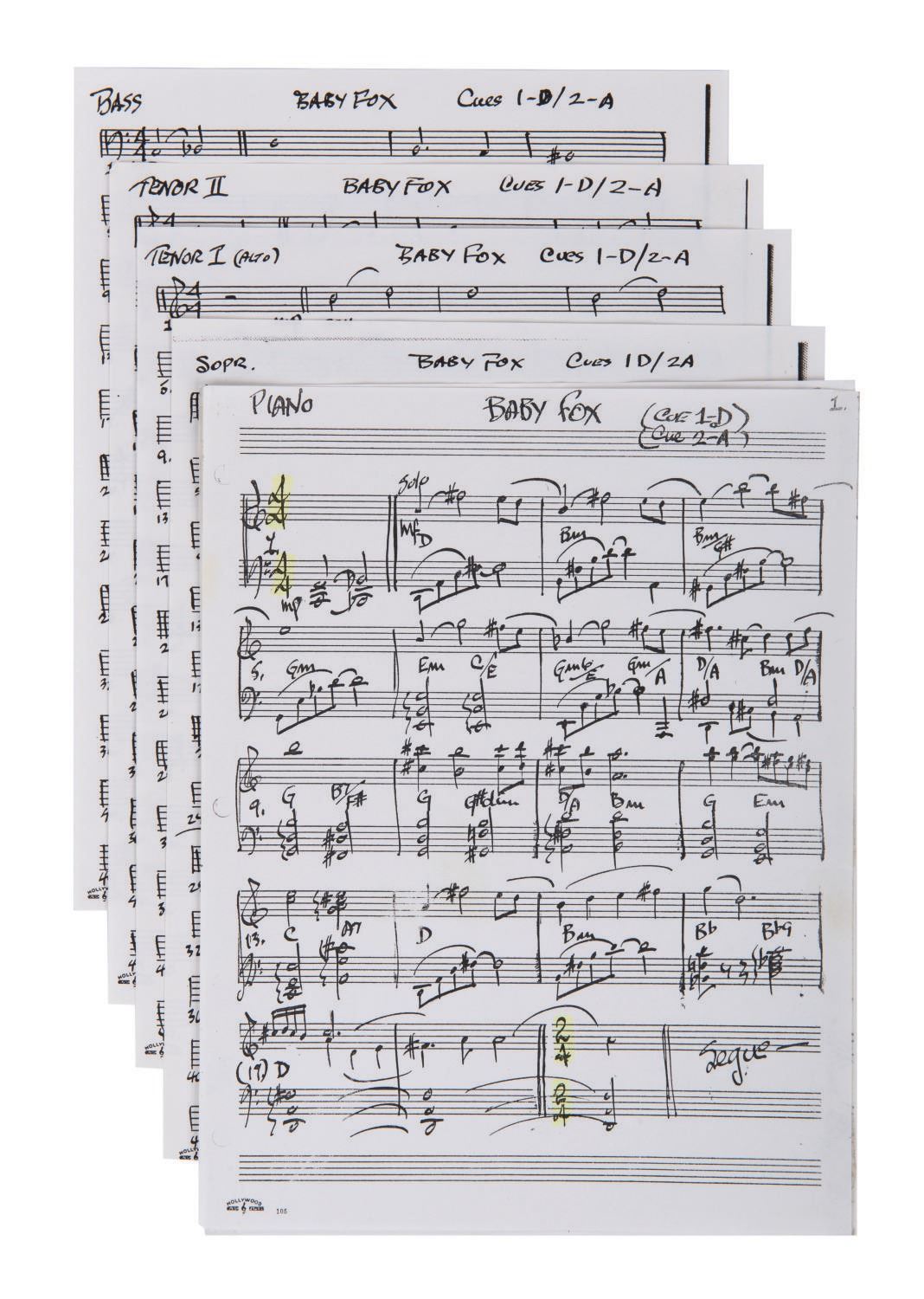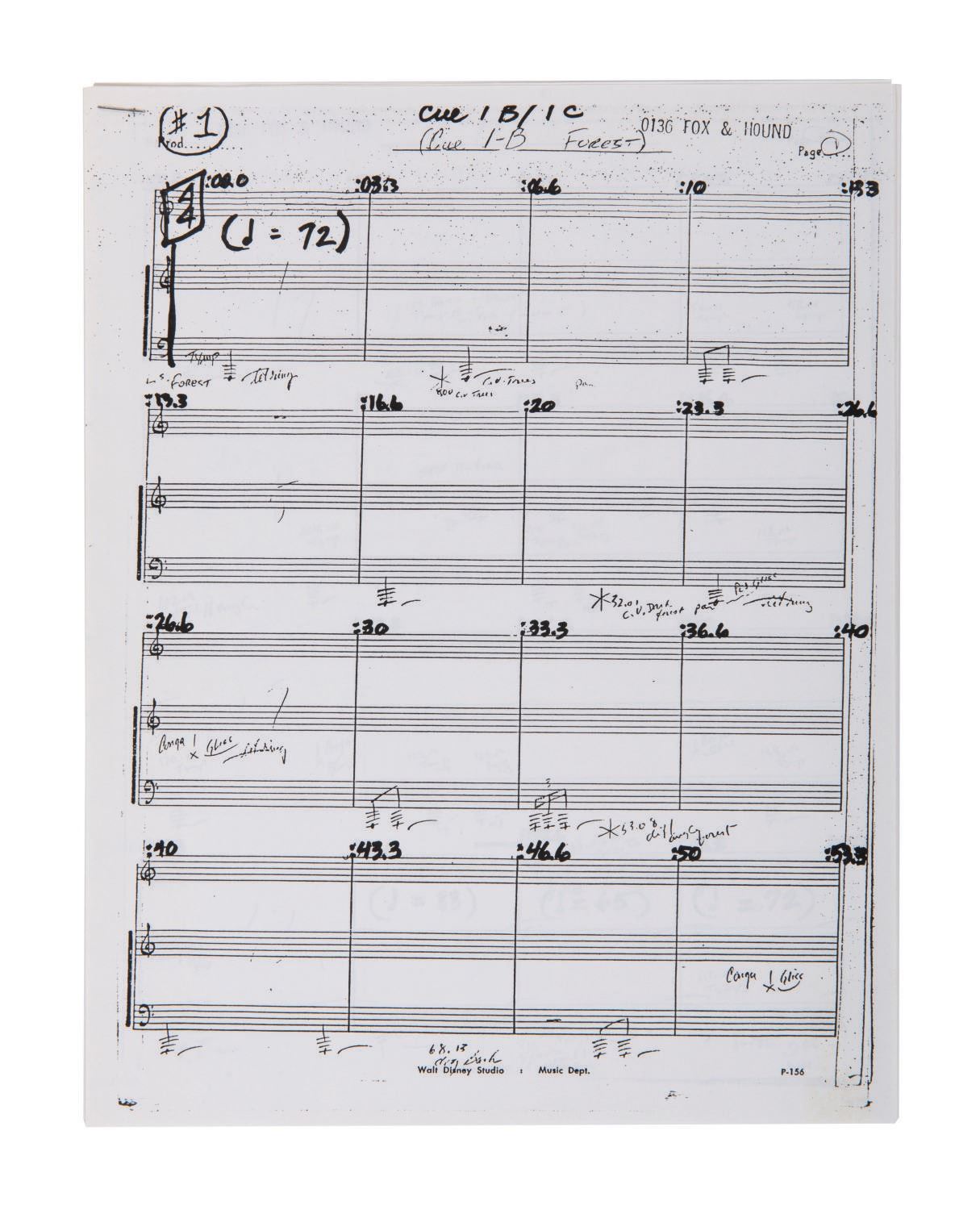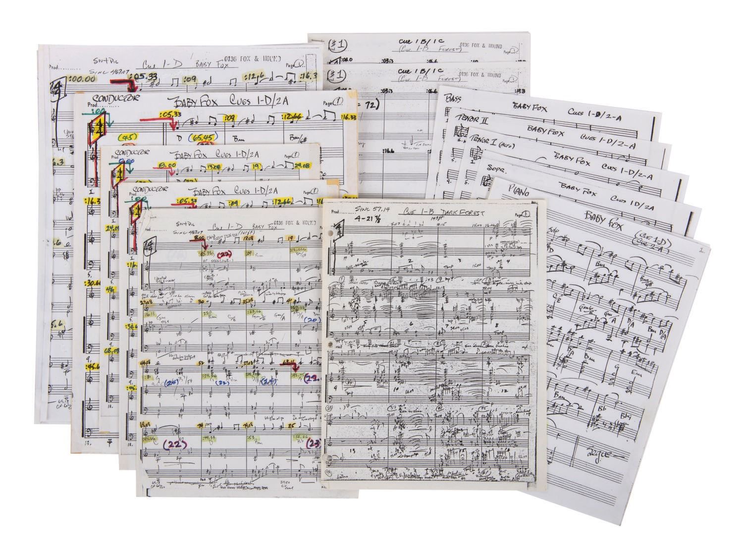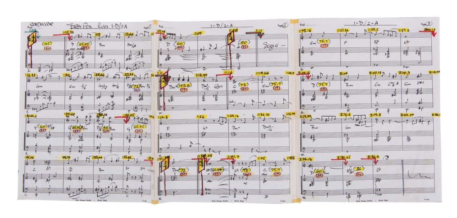 (Disney, 1981) A collection of (22) pages of orchestral scores used in the production of Disney's 1981 feature film "The Fox and the Hound." The hand-annotated and amended conductor score sheets Included music for sequences like "Baby Fox Cues," "Wilderness," and "Dark Forest." Measuring 13.75"x11" to 11"x8.5" the sheets are in very good condition with some creases, folds, and wear to edges and corners from use.