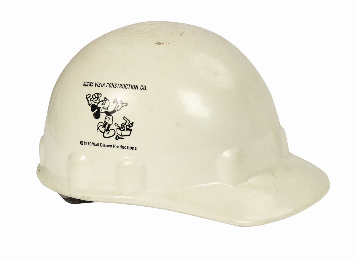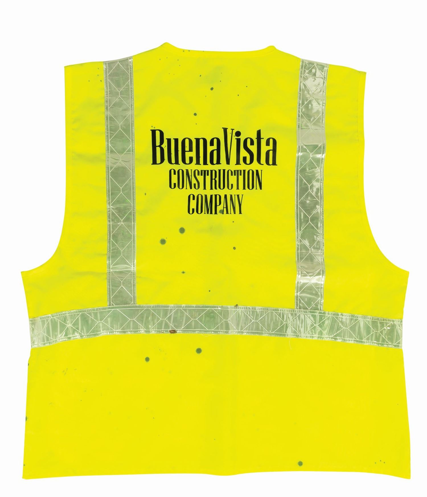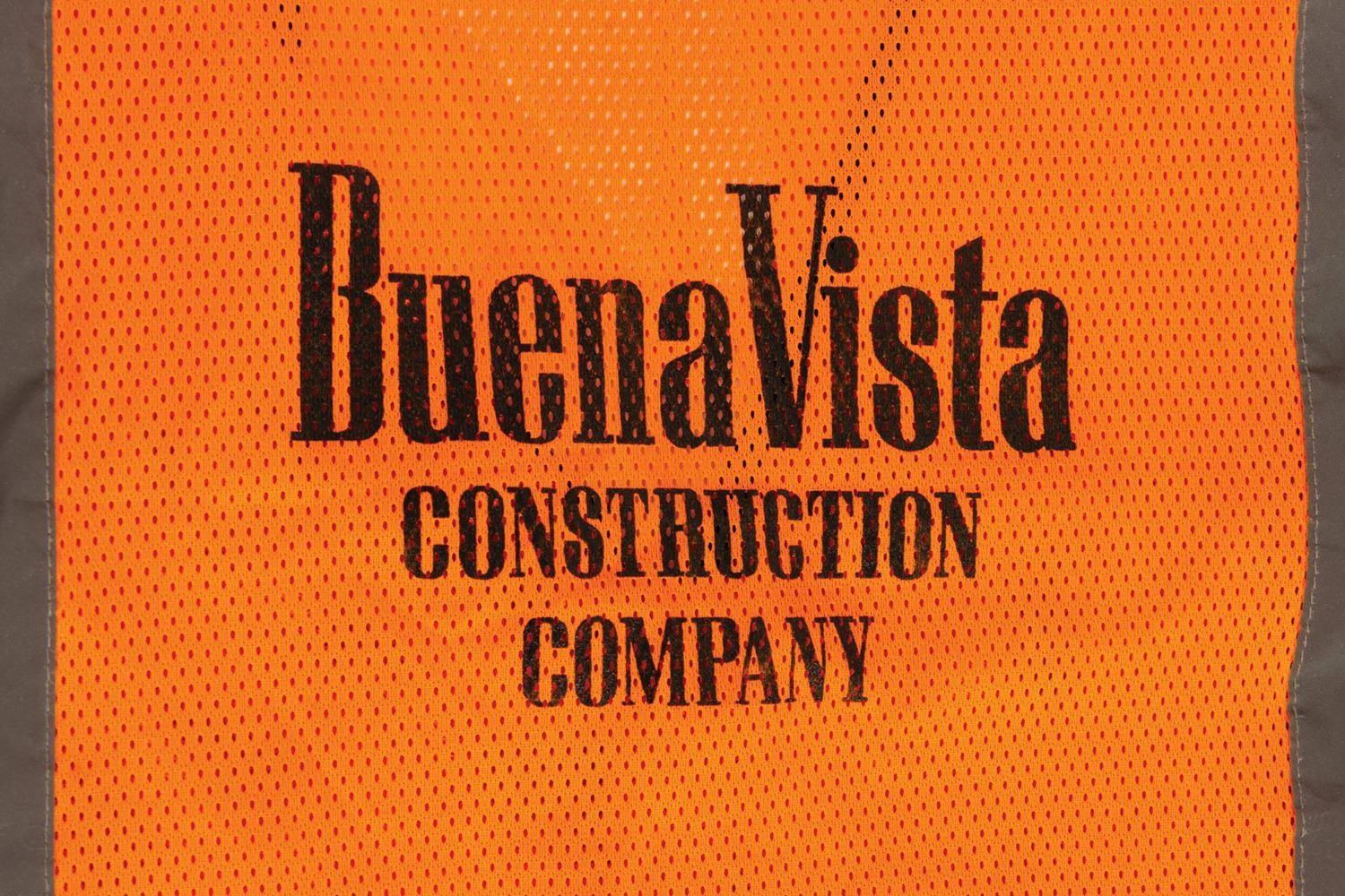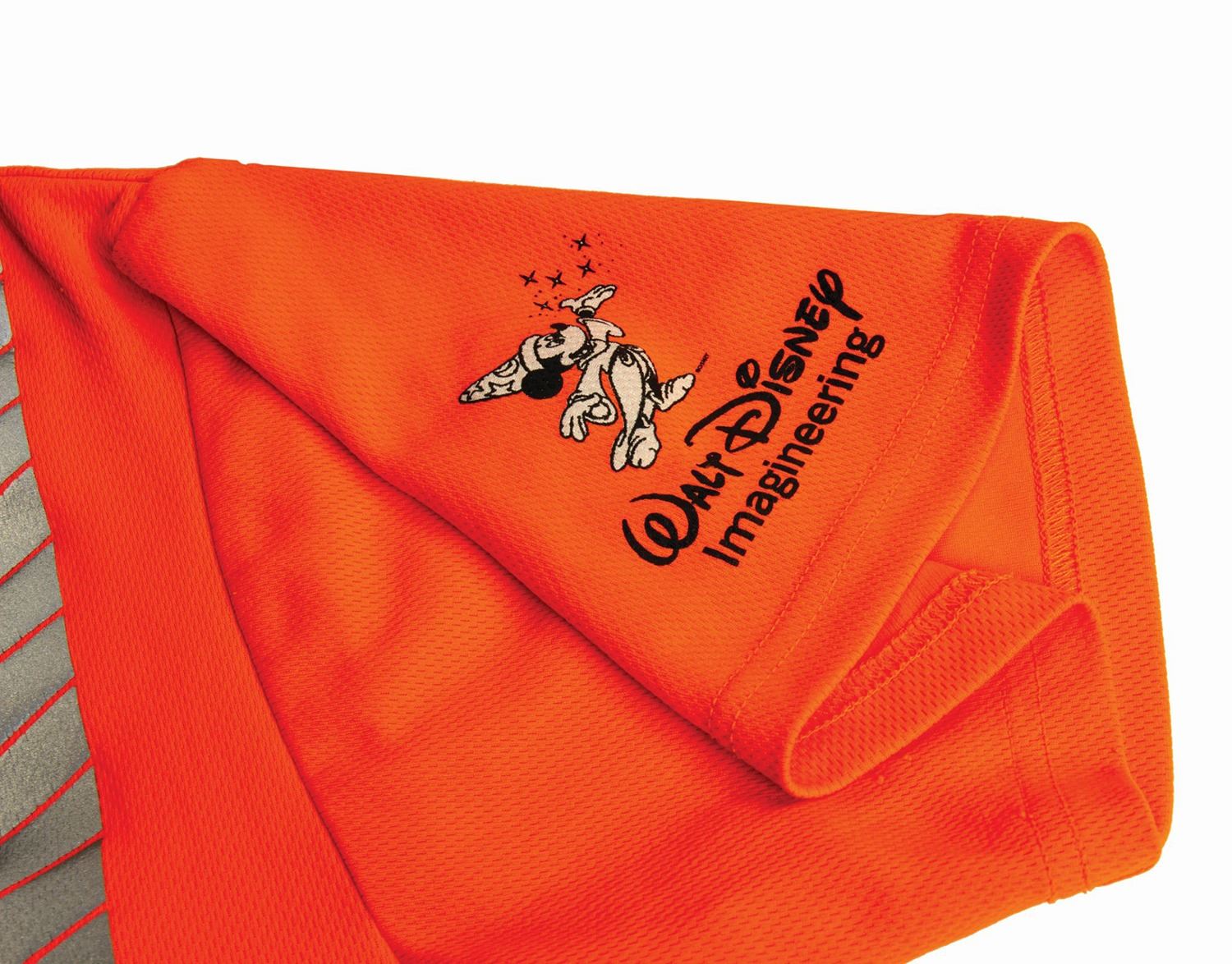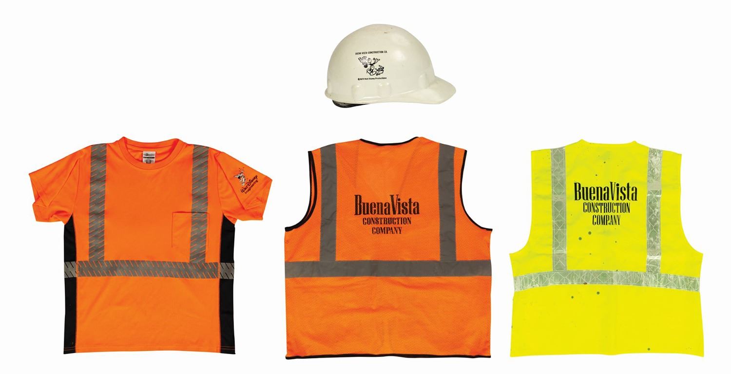 (Walt Disney World, c.1981-2010) A set of wardrobe items used by employees of Disney's in-house construction company, Buena Vista Construction Co. The wardrobe includes a hardhat from 1981, as well as a Walt Disney Imagineering shirt, outer orange safety vest, and green safety vest, all from approximately 2010. The shirt is a size M, while the vests are size L. The set is in good overall condition, with some wear to the hardhat from use, and scattered spots of staining to the clothing from use.