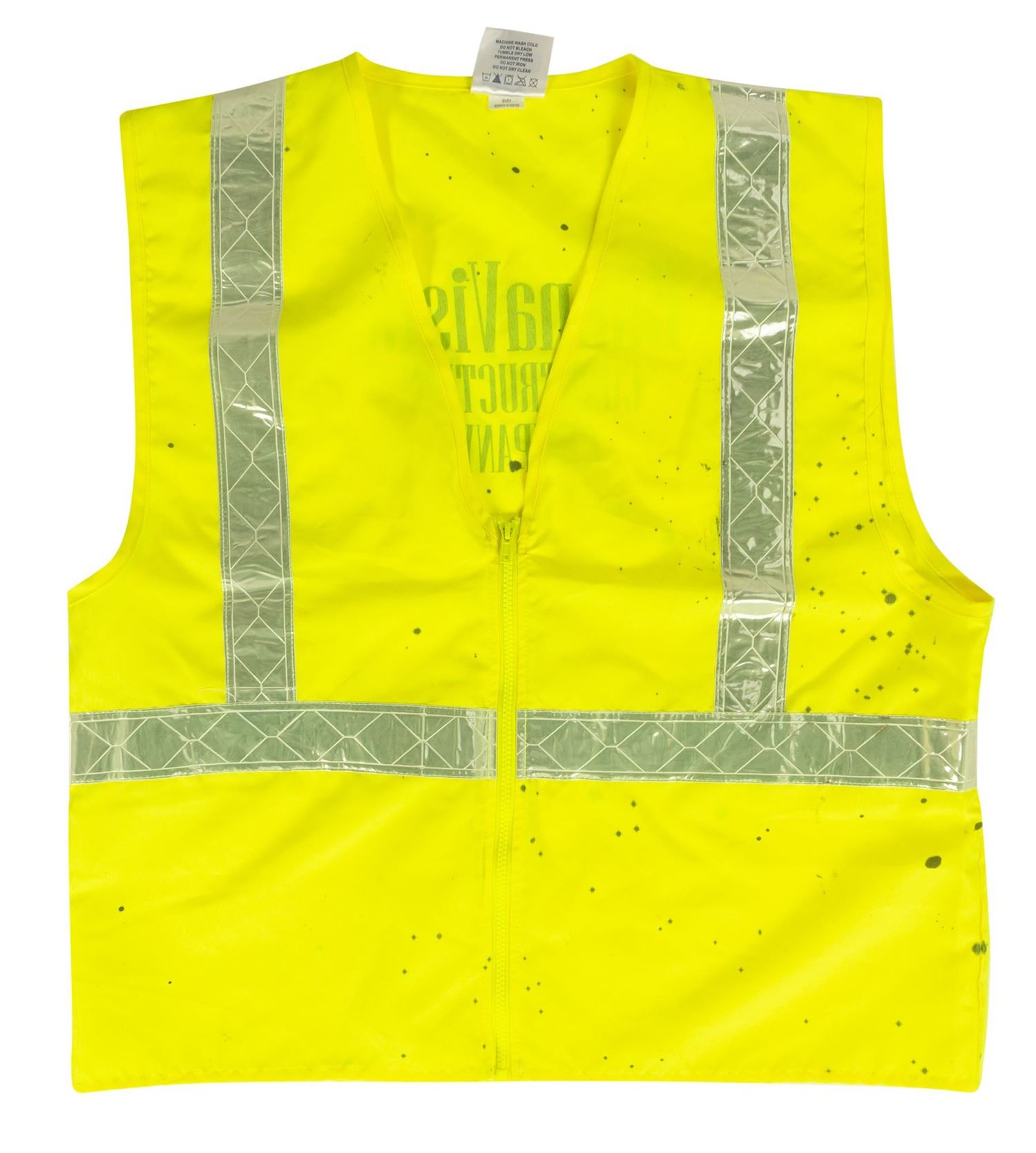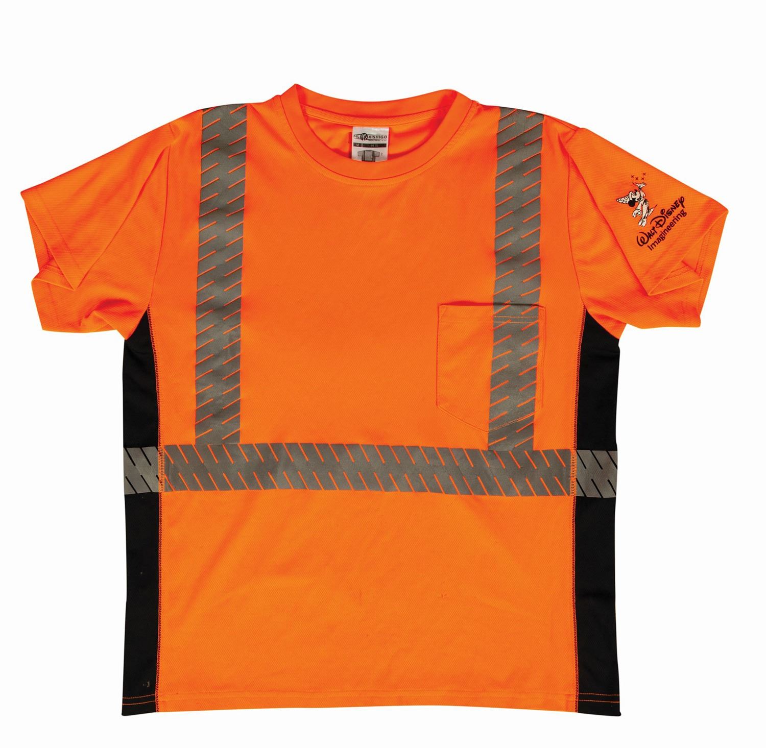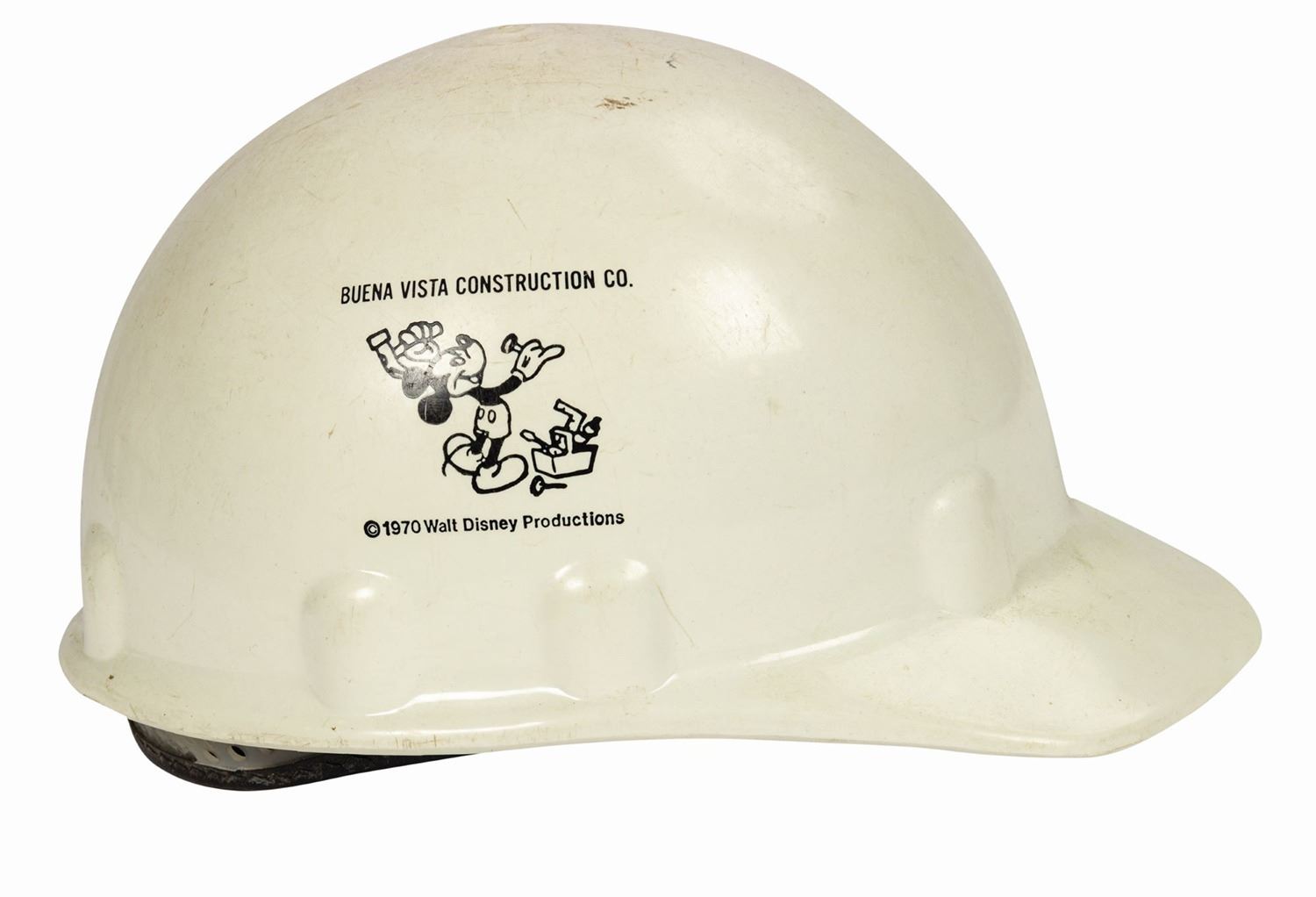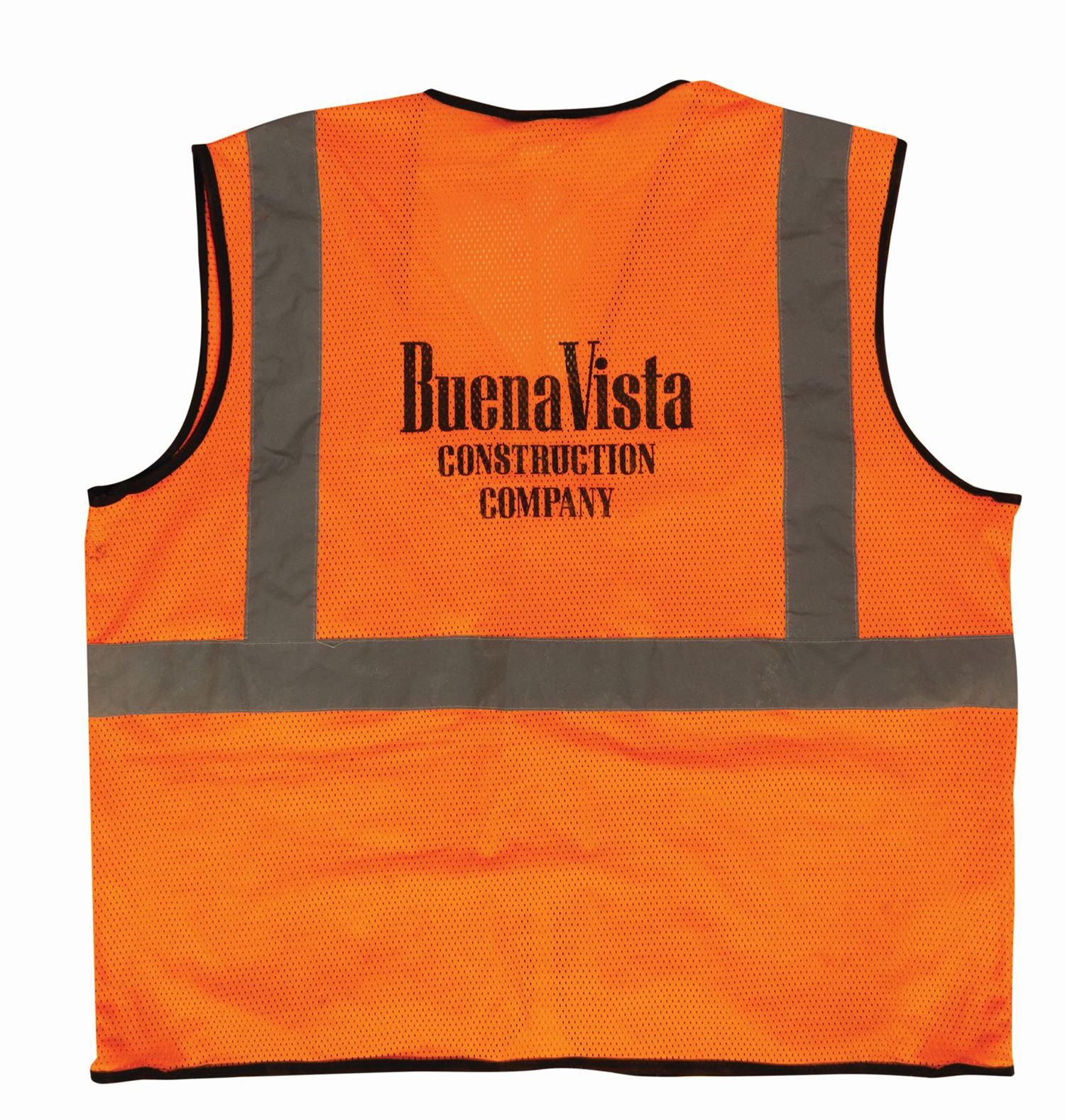 (Walt Disney World, c.1981-2010) A set of wardrobe items used by employees of Disney's in-house construction company, Buena Vista Construction Co. The wardrobe includes a hardhat from 1981, as well as a Walt Disney Imagineering shirt, outer orange safety vest, and green safety vest, all from approximately 2010. The shirt is a size M, while the vests are size L. The set is in good overall condition, with some wear to the hardhat from use, and scattered spots of staining to the clothing from use.