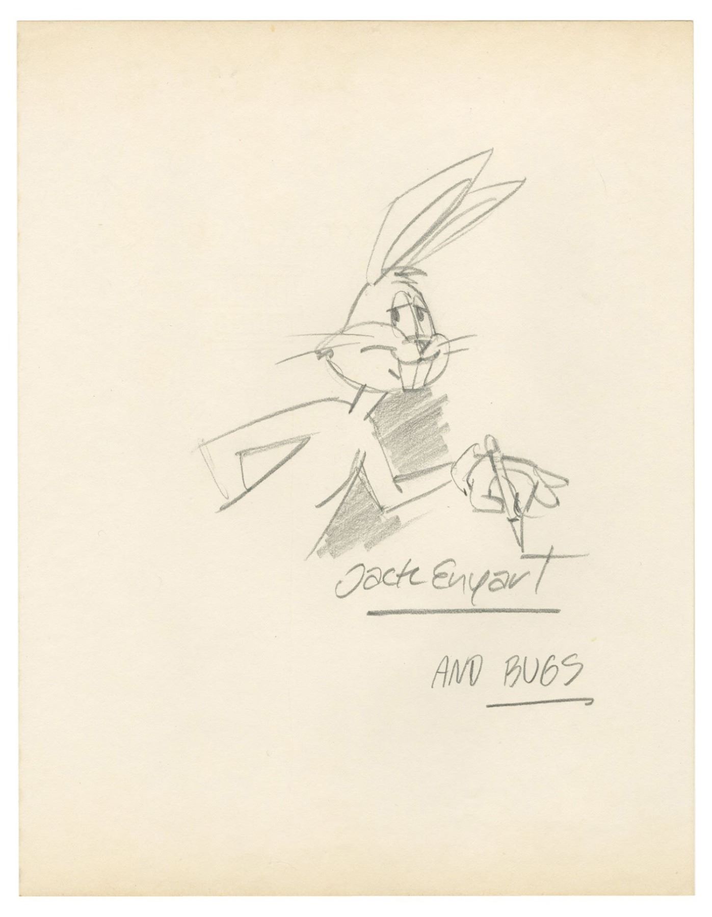 (Warner Bros., c.1980) An original drawing of Bugs Bunny that was created and signed by animation writer Jack Enyart. Enyart is known for his story work on several Bugs Bunny cartoons from the late 1970s and early 1980s including "Bugs Bunny's Thanksgiving Diet," "The Bugs Bunny Mystery Special," and "Bugs Bunny's Mad World of Television." This drawing depicts bugs with a writing pencil signing Enyart's name, and is accomplished in pencil on thin paper. Measuring 11"x8.5", the paper is in good condition with some faint creasing and minor yellowing around the edges.