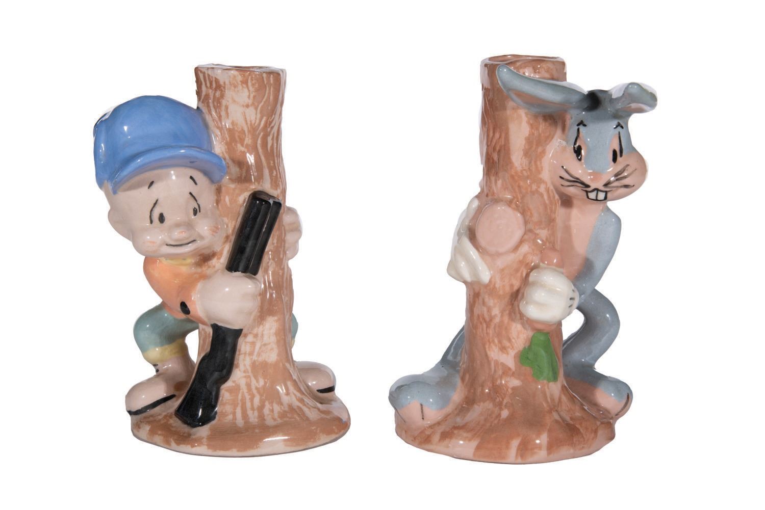 (Shaw, 1940's) A pair of painted glazed ceramic character bud vases by Shaw Pottery. Both Elmer Fudd and Bugs Bunny peer around a tree trunk, on the lookout for each other. Measuring 6.5" and 7" tall, both vases are in fine condition, exhibiting mild crazing to glaze on close inspection.