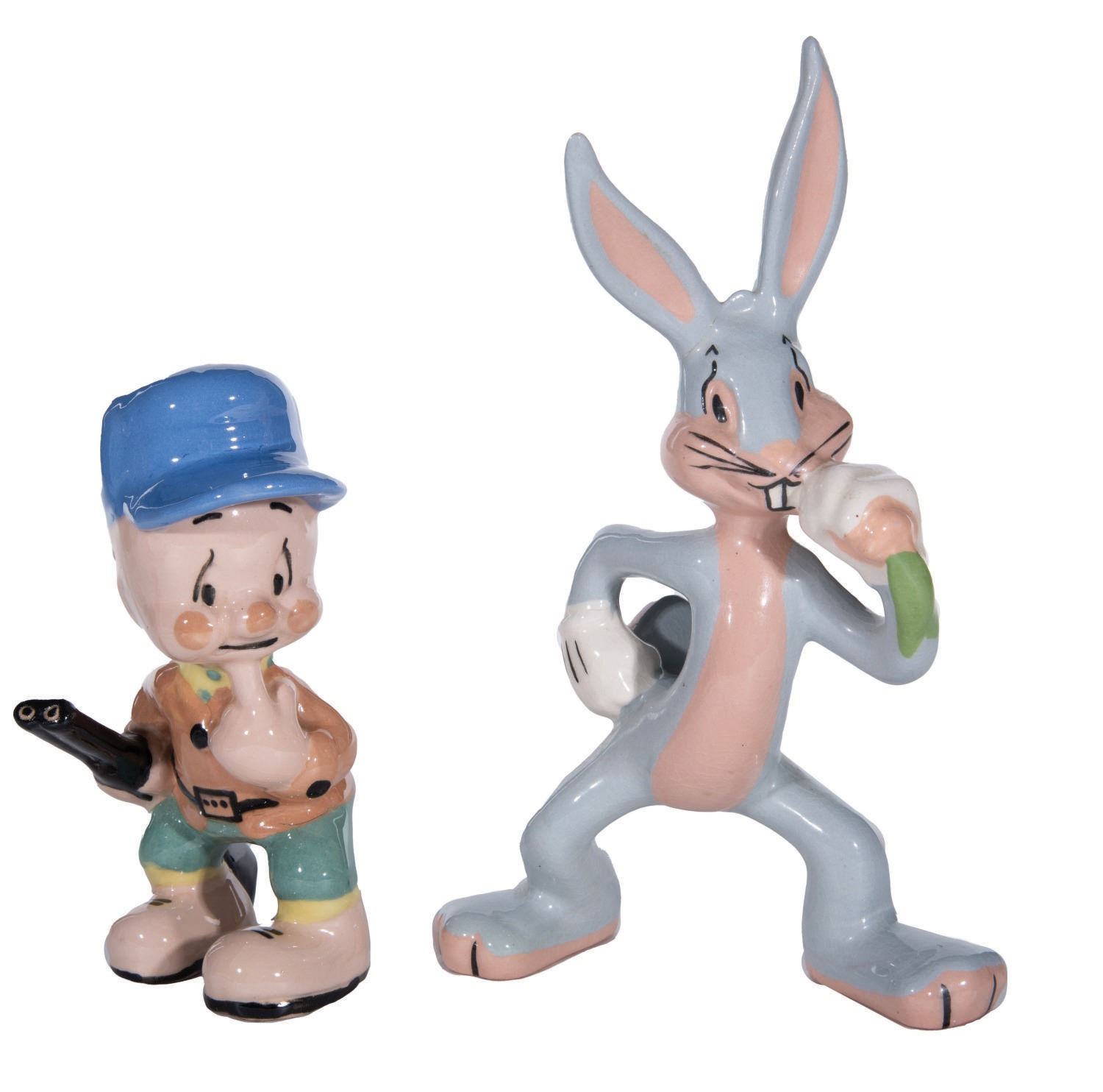 (Shaw, 1940's) A pair of Bugs Bunny and Elmer Fudd painted glazed ceramic figurines by Shaw Pottery. Bugs Bunny was produced in many different poses by Shaw; this style eating a carrot is considered scarcer than others. Measuring 8.75" and 6" tall, the figures are in very good condition, exhibiting slight crazing to glaze.