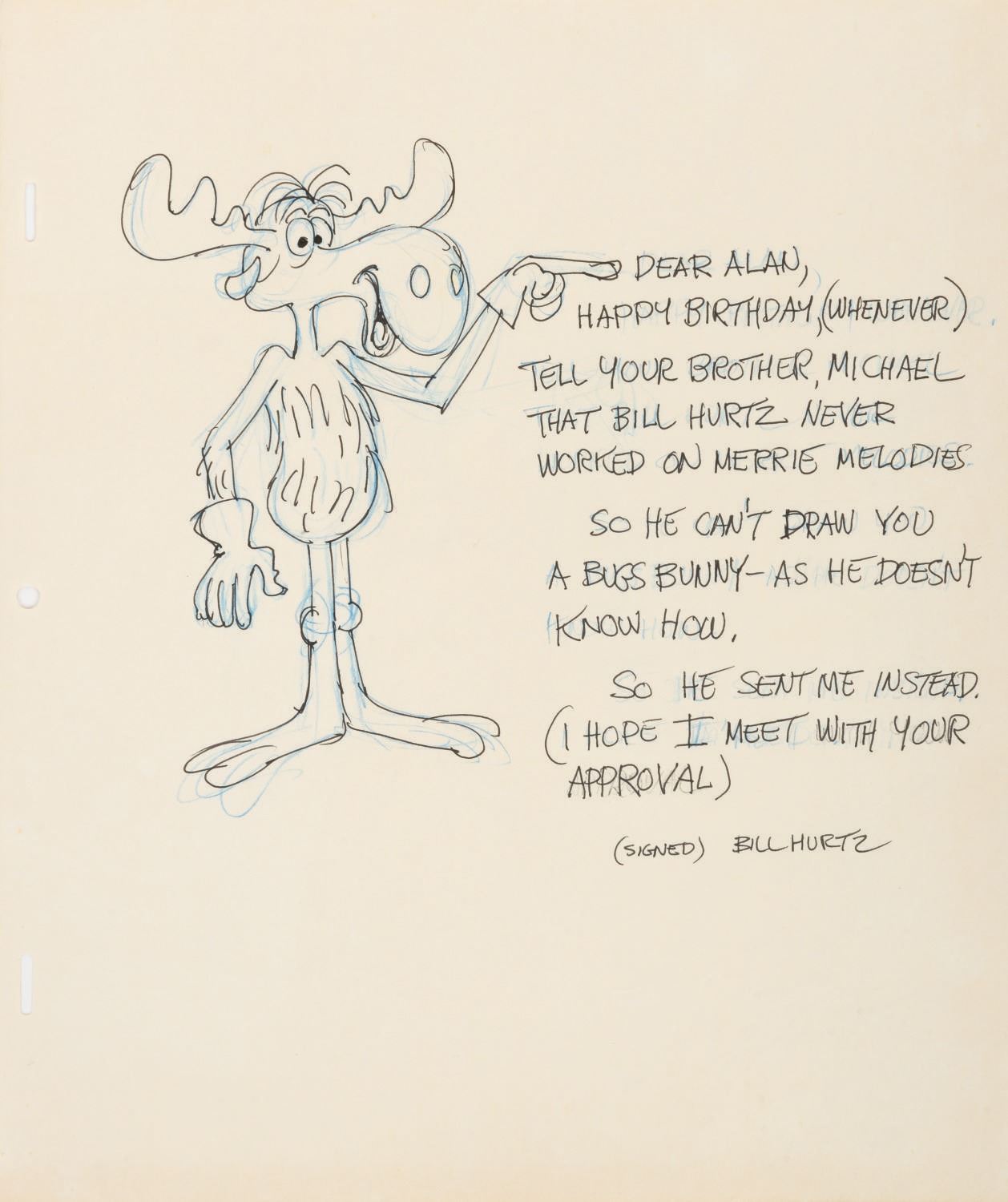 (Jay Ward, c.1980) An original drawing by Bill Hurtz of Bullwinkle from "The Bullwinkle Show." Hurtz is known for his work as both an animator and director, contributing to projects such as "Fantasia," "Pinocchio," and numerous Jay Ward series like "Peabody's Improbable History" and "The Bullwinkle Show." Hurtz personalized the drawing with a note to super-collector Alan Hylton wishing him happy birthday and explaining that he never worked on Merrie Melodies. Created in ink and colored pencil on art paper, the drawing measures 12.5"x10.5" and is in very good condition. There is minimal wear, including some light wrinkling to the paper along the bottom edge.