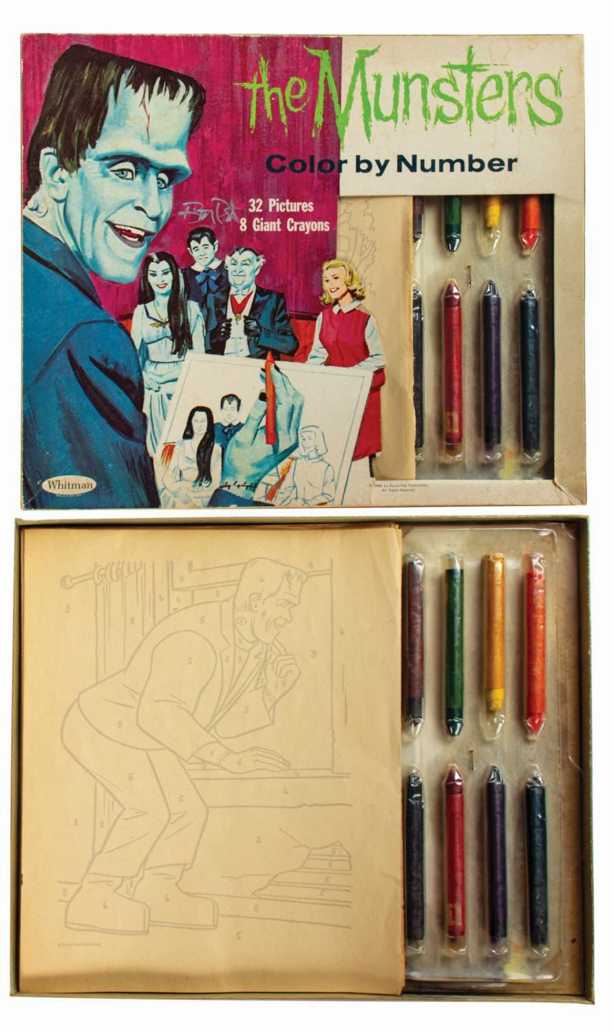 (Whitman, 1960s) A vintage The Munsters Color By Number Set. The set contains 8 crayons and 28 printed Color By Number images. The items are assembled in the original cardboard box packing. The lid, depicting Herman coloring a portrait of the family, is signed in silver ink by actor Butch Patrick, who played Eddie Munster. Measuring 11"x13.25" and 1.25" deep, the box is in good condition. It exhibits some browning, split corners repaired with discolored tape, and some grease staining from the crayons. The crayons have been partially used, 7 of the Color By Number pages have been used, and some pages exhibit tiny tears, holes, and/or handling,