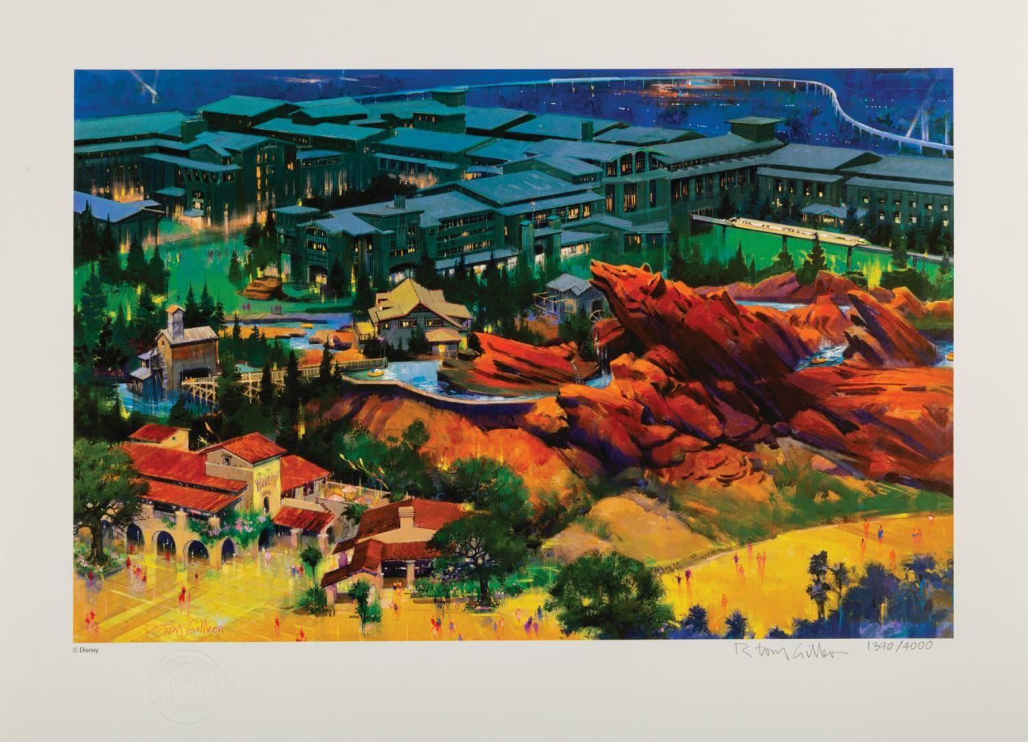 (California Adventure, 2001) A cast member-exclusive limited edition lithographic print of a concept painting created for Disney California Adventure by artist R. Tom Gilleon. Released as part of the Cast Member Commemorative Series, the artwork, depicting the Grizzly Peak portion of the park and the Grand Californian Resort Hotel, is signed and hand-numbered in pencil at bottom right, "R. Tom Gilleon 1390/4000." The print retains an embossed series stamp at bottom left. Measuring 14.5"x20" with an image size of 11"x17", the piece is in fine condition with minimal wear.