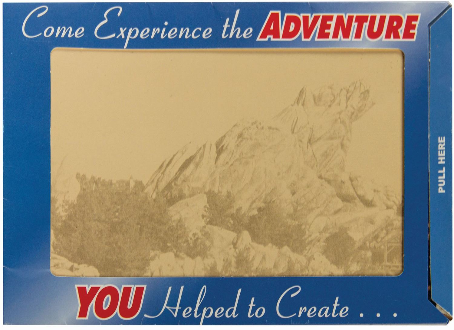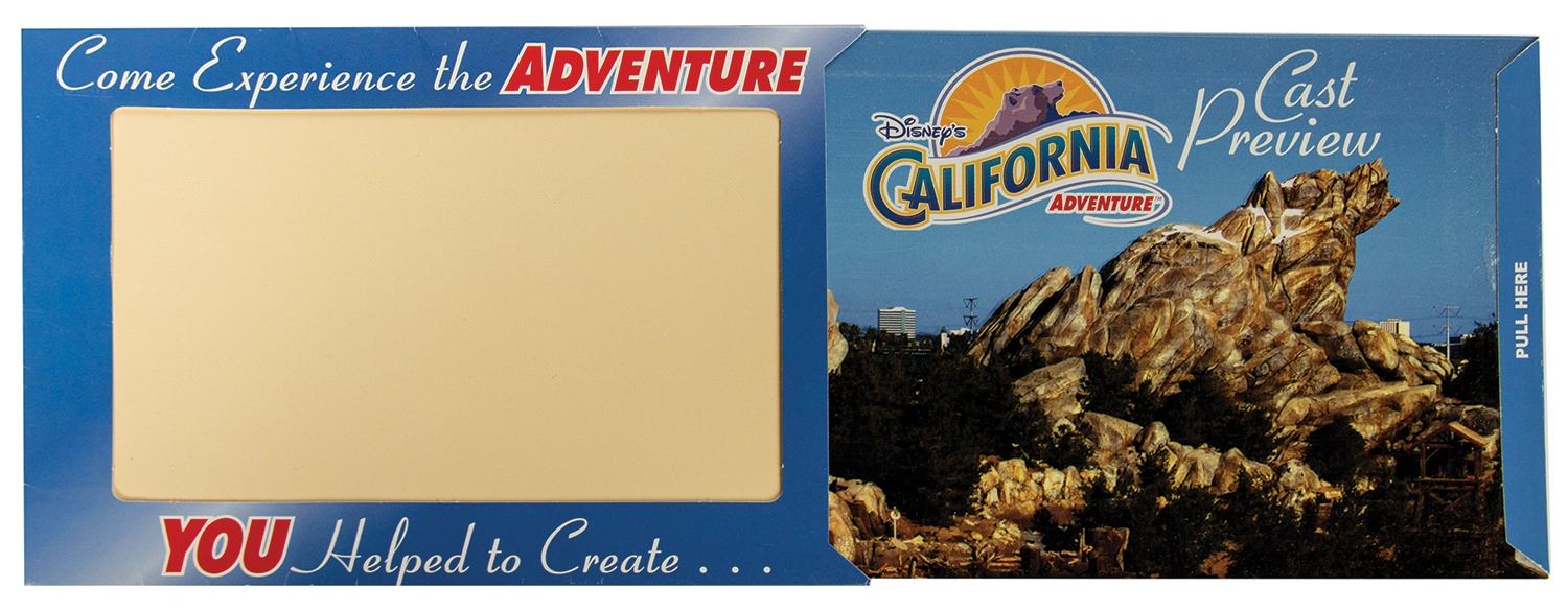 (California Adventure, 2001) A rare cast preview invitation for California Adventure. Cast members and their guests were invited to visit the park in January of 2001 before its public opening in February. The front of the invitation was created to look like an antique sepia-tone photo with a pull-tab that extends to reveal a contemporary color image of Grizzly Peak. The invitation measures 5"x7" and is in very good condition with some edge wear.
