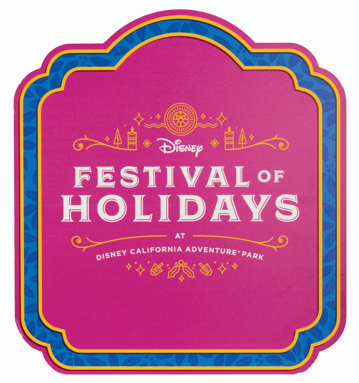 (California Adventure, c.2018) A Disney Festival of Holidays sign utilized at California Adventure. The seasonal celebration of Christmas, Hanukkah, Diwali, Kwanzaa, and Three Kings' Day is filled with multicultural and diverse music, foods, dance, and decor. The sign features the "Disney Festival of Holidays" event title surrounded by imagery of trees, candles, dreidels, and Mickey's Fun Wheel. Measuring, 20"x18", the sign carries very minor edge wear, scratches, and scuffs due to Park display.