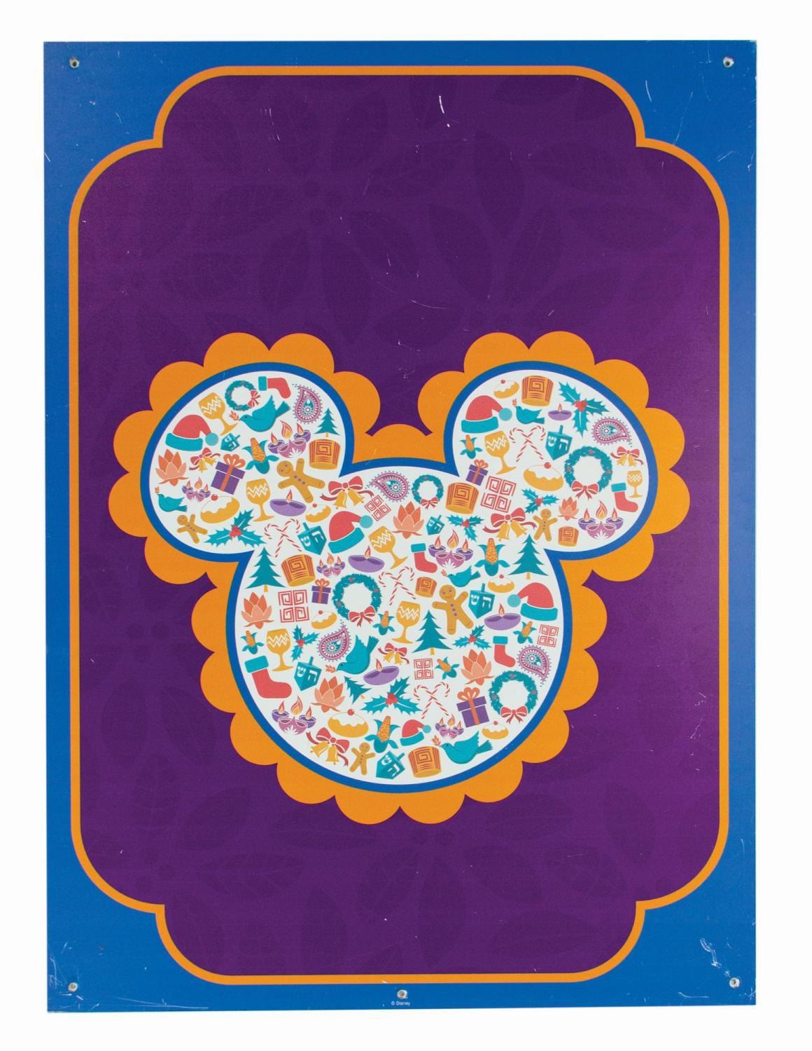 (California Adventure, c.2010s) A sign used during the popular Festival of Holidays event at Disney's California Adventure. The festival celebrates winter holidays around the world with food and performances, and this sign captures that spirit with a central Mickey head filled with symbols of worldwide holiday traditions. Printed on thin metal with a dense foam core, the colorful sign measures 26.5"x19". The condition is very good with expected wear from park use, including some scratching and scuffing to the surface, and wear around the screw-holes from prior mounting.