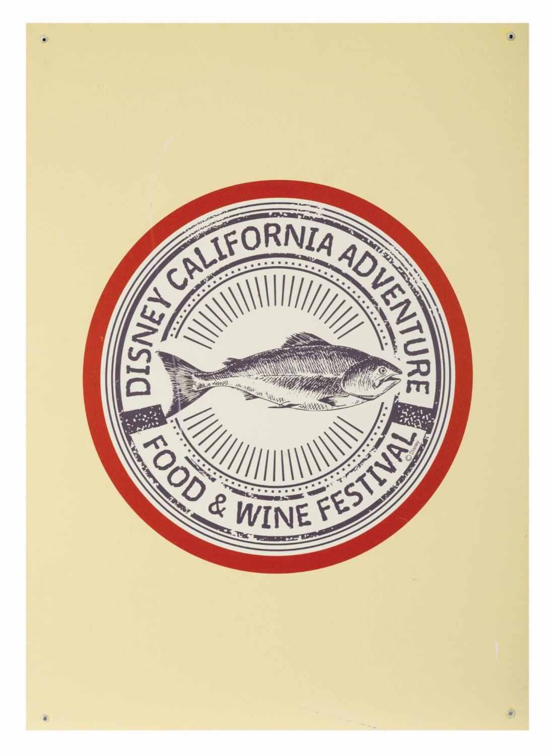 (California Adventure, c.2010s) An original Park-used Disney California Adventure Food & Wine Festival sign. Consisting of a sturdy form core face with thin sheets of metal, the printed sign features a circular festival logo with the name around the edge and an image of a fish in the center. The sign retains holes in the corners for mounting. Measuring 26.5"x19", the sign is in very good condition with minor surface wear including some scuffing and scratching from park use.