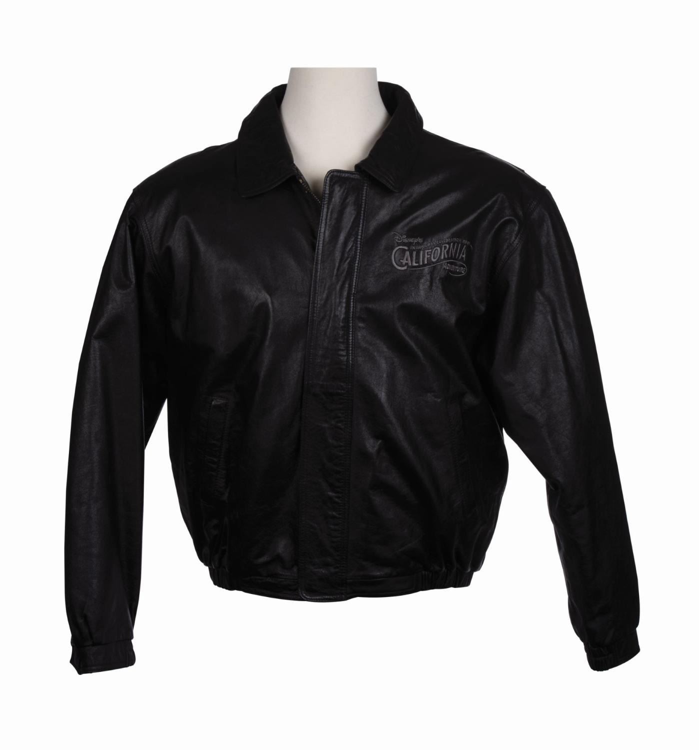(California Adventure, 2001) A limited edition 2001 California Adventure Inaugural Celebration black leather bomber jacket. The jacket features a folded collar, an embroidered event logo on the left chest, waist slash pockets, elastic waist and sleeve cuffs, and concealed zipper front closure. The back of the jacket boasts a large, full-color embroidered patch depicting an elaborate Grand Opening graphic logo. The quilted interior lining retains a Port Authority maker's patch and the embroidered text "Limited Edition" on the interior chest pocket. A size "L," the jacket remains in fine condition.