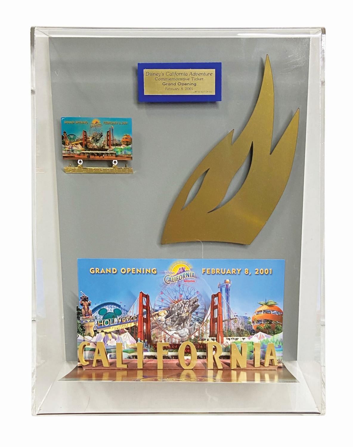 (California Adventure, 2001) A very special framed premiere edition of the grand opening ticket for Disney's California Adventure on February 8, 2001. This premiere edition was limited to only 500 pieces and includes the pop-out ticket, a commemorative pin, and an actual section of the large titanium sun icon guests could see at the entrance to the park. An additional smaller commemorative pin is included separate from the display, and the original COA marking this as 454/500 is attached to the reverse. The display measures 14.5"x11.5" and 5.75" deep, and is in very good condition with minor wear and comes in its original box and packaging.