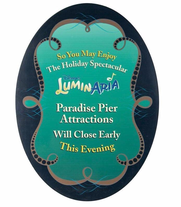 (California Adventure, 2001) A very rare sign from Disney's California Adventure warning guests that the attractions on Paradise Pier will close early due to the "LuminAria" show. Disney's "LuminAria" was a fireworks show on Paradise Bay that only lasted a few months, as such, items relating to "LuminAria" are exceptionally rare. This item measures 25.25"x18.5" and is in good condition with some surface wear.