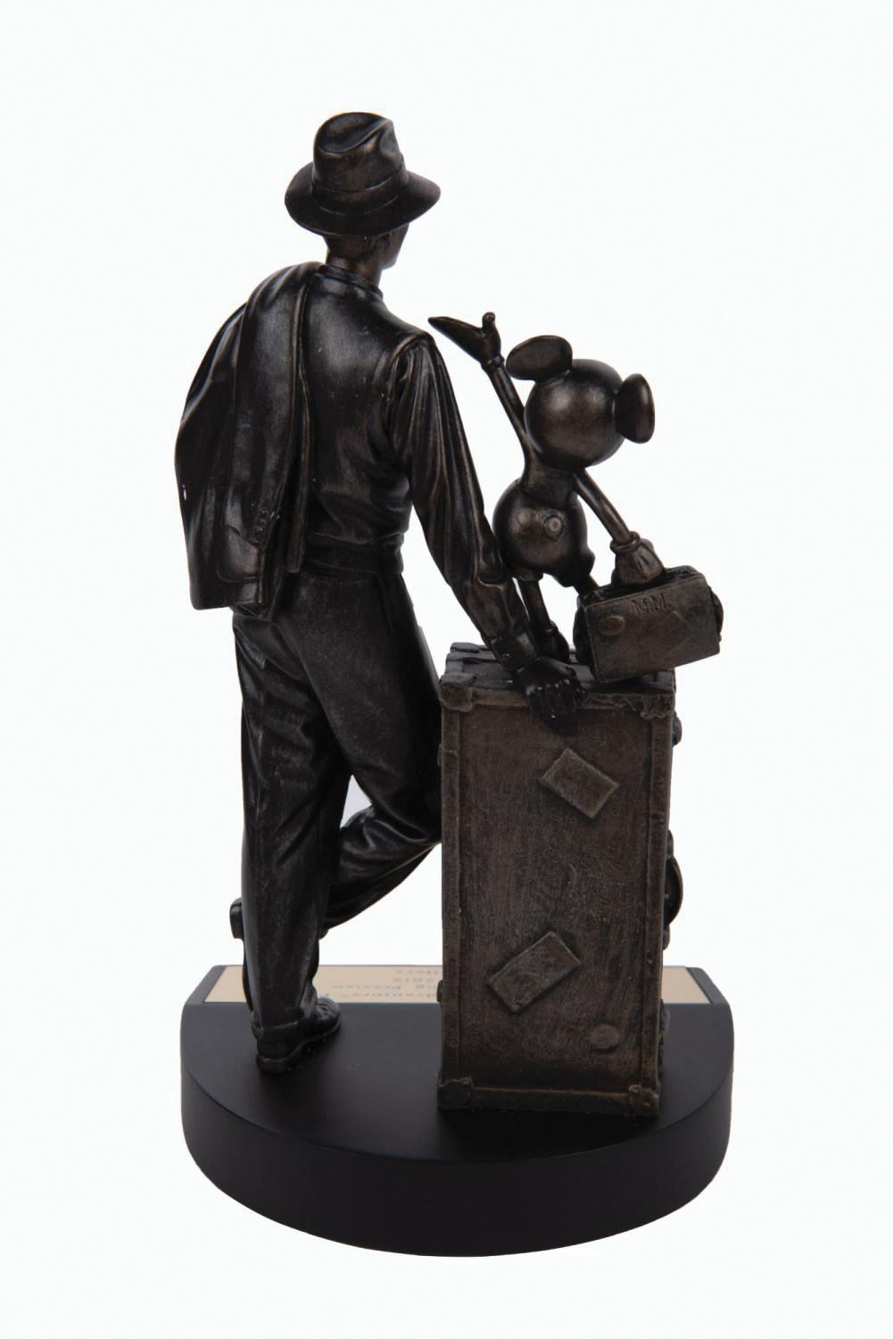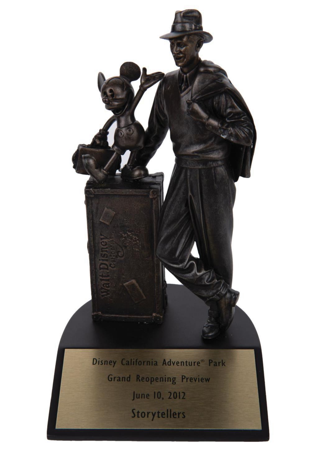 (California Adventure, 2012) A miniature reproduction of the Storytellers statue as Imagineered by the team of Ray Spencer and sculptor Rick Terry. It celebrates the humble beginnings of Walt's story, as he arrived in California with big dreams in 1923. The small incarnation of the full-scale bronze was created exclusively for those attending the Disney California Adventure Park Grand Opening Preview events of June 10, 2012. Measuring 8.25" tall atop a 4.25"X4.75" base, the commemorative statue bearing a bronze-like patina atop a black matte resin base displays in very fine condition. The original box and packaging is included.