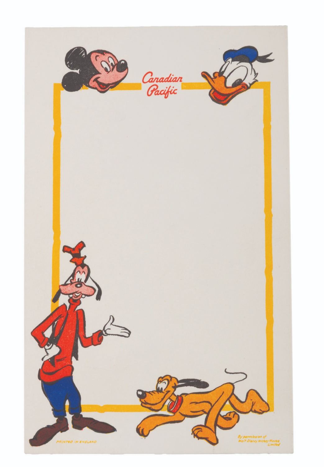 (Canadian Pacific Railway, 1950s-60s) A note card from the Canadian Pacific Railway featuring Disney characters. Measuring 5” x 8”, the card is in fine condition with a pencil mark on the back.