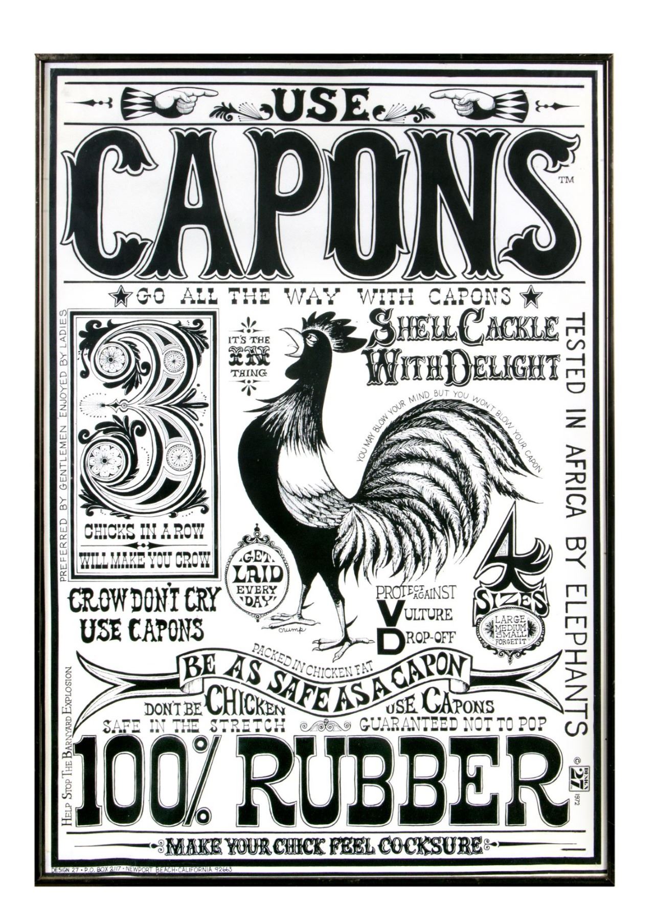 (1972) A vintage poster created by Rolly Crump featuring his artwork for "Capons" condoms. This large poster comes from Rolly's personal collection, and measures approximately 31.5"x22.5" in its original frame. The condition is good with a slight curve to the bottom-left corner of the poster.