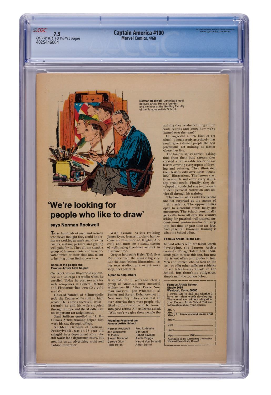 (Marvel, 1968) The first silver age issue of Captain America (#100). Cap had been appearing in the "split book" Tales of Suspense alongside Iron Man since issue #59 in November of 1964. After issue #99 the book was retitled as Captain America's solo title. This issue first recounts the hero's return from the ice first told in Avengers #4, before continuing a story with Black Panther and Baron Zemo. With pencils by Jack Kirby and script by Stan Lee, this is a true classic from the original Marvel Bullpen. Graded 7.5 by CGC, TK