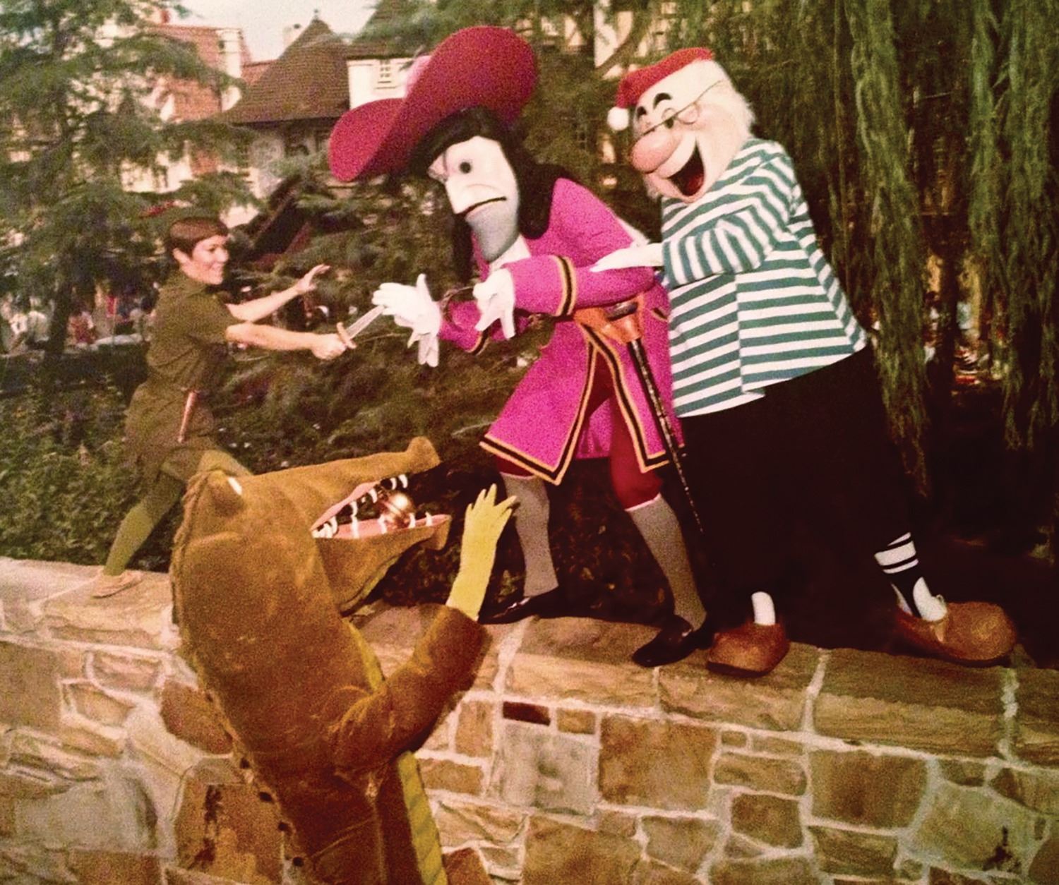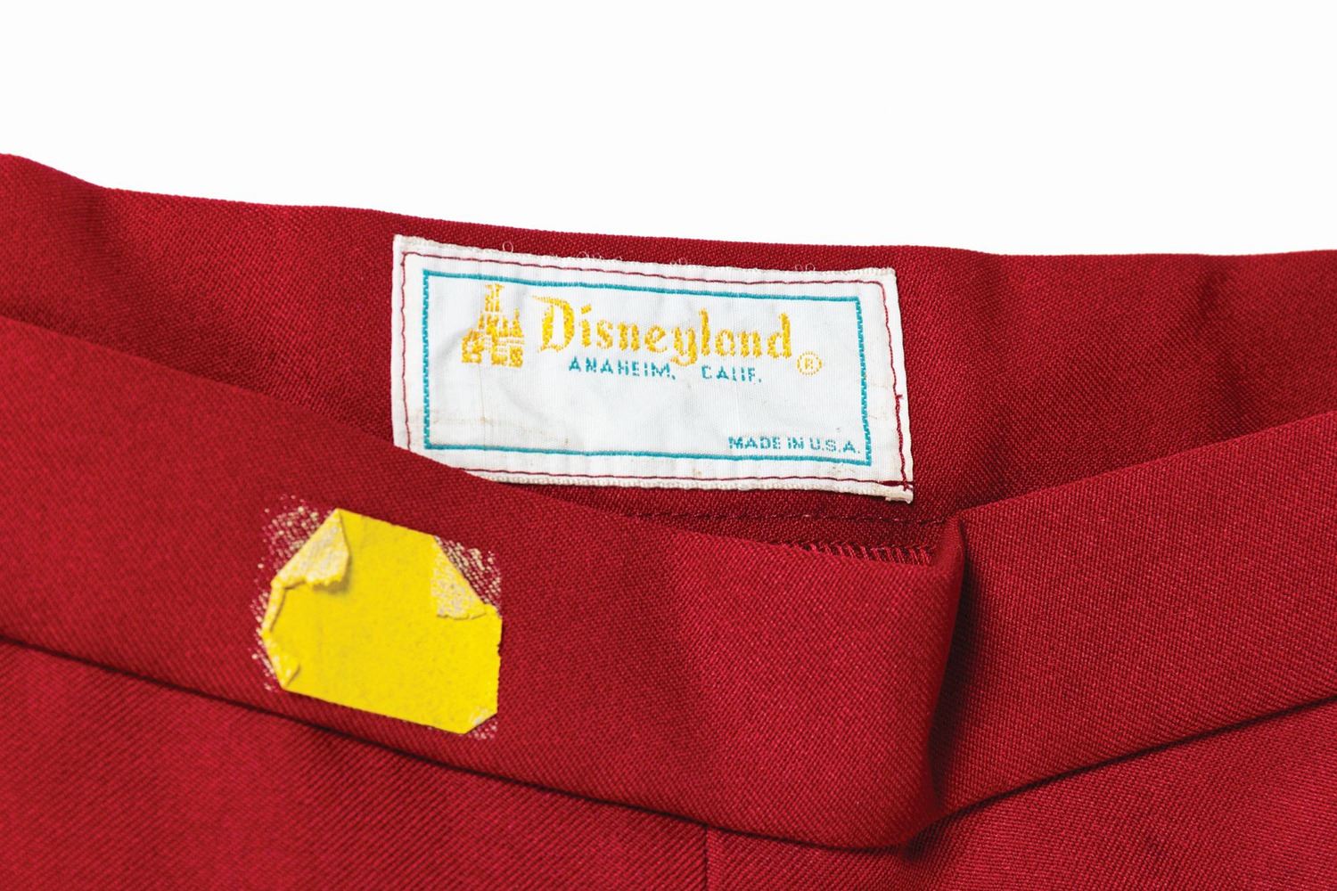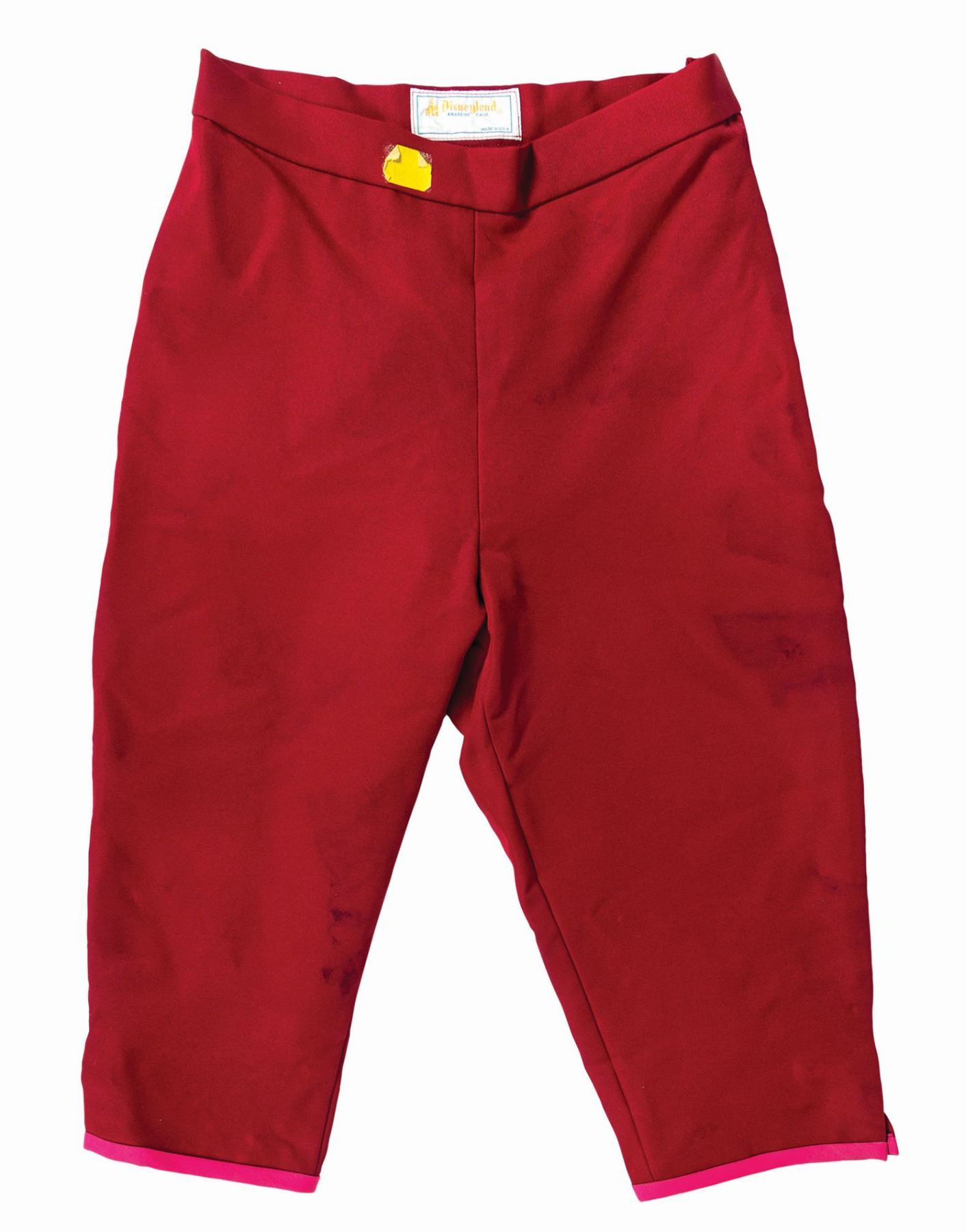 (Disneyland, c.1980s) Original park-worn pirate breeches from a Captain Hook walkaround character costume. The burgundy short trousers feature a side zipper and double tab and eye closure, tab and eye leg vent closures, and pink piping at the leg opening. As this is a costume for a specific character, no size is indicated. The garment retains an internal Disneyland label and is in very good condition. It exhibits some oxidation to the side zipper, faint black scuffing on the front of the lower right leg, and residue from a piece of yellow gaffer tape on the waist.