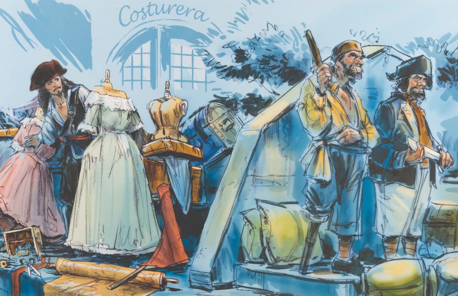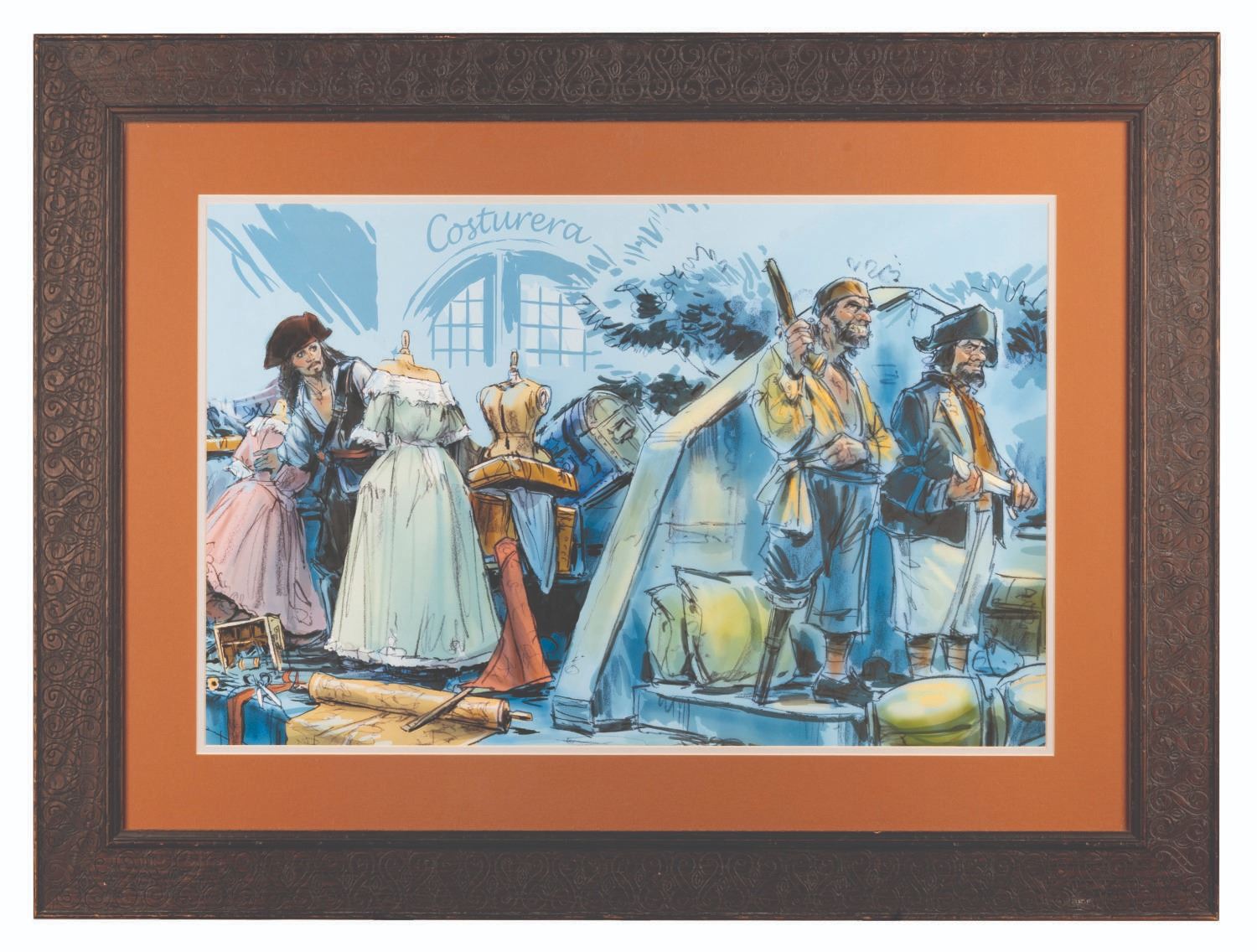 (Disney’s Caribbean Beach Resort, 2009) A framed print depicting Captain Jack Sparrow hiding behind dresses in the Pirates of the Caribbean ride. Based on concept art by Imagineer Chris Turner, this print shows one of the Sparrow-centric refurbishments made to the attraction in 2006 due to the popularity of the “Pirates of the Caribbean” film franchise. This framed art was originally displayed on the walls in the Pirate Rooms at Disney’s Caribbean Beach Resort. Measuring 18.5” x 28.5” in a 24.5” x 34.5” matte of a 30” x 40.25” glassless frame, the wall art is in fine condition with light wear and intentional distress on the frame.